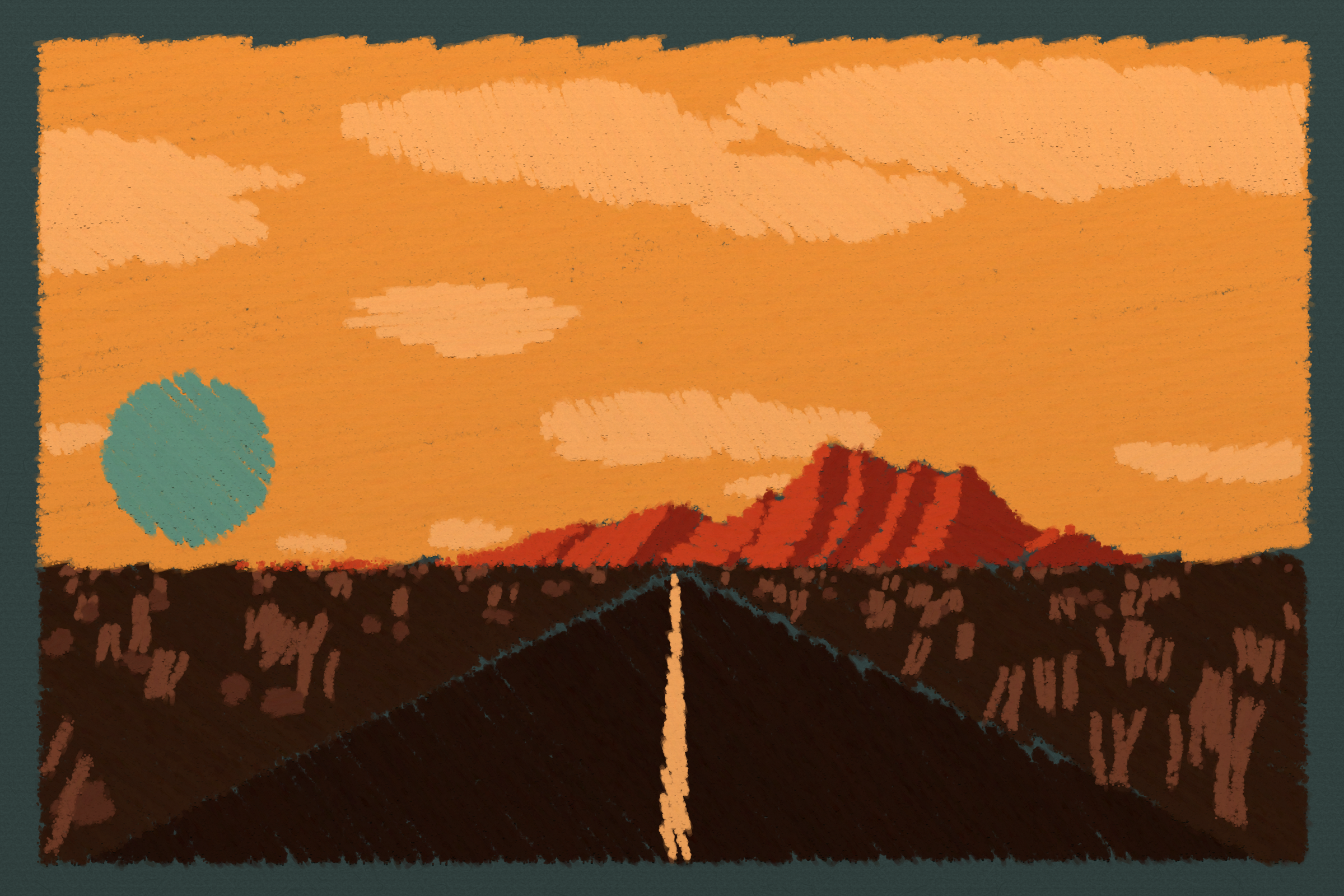 *Arcadia* is a homage to the fridge-worthy landscape art of our youth. Childhood techniques of creating art are re-imagined by the scribbles of a nostalgic, computer-assisted mind.