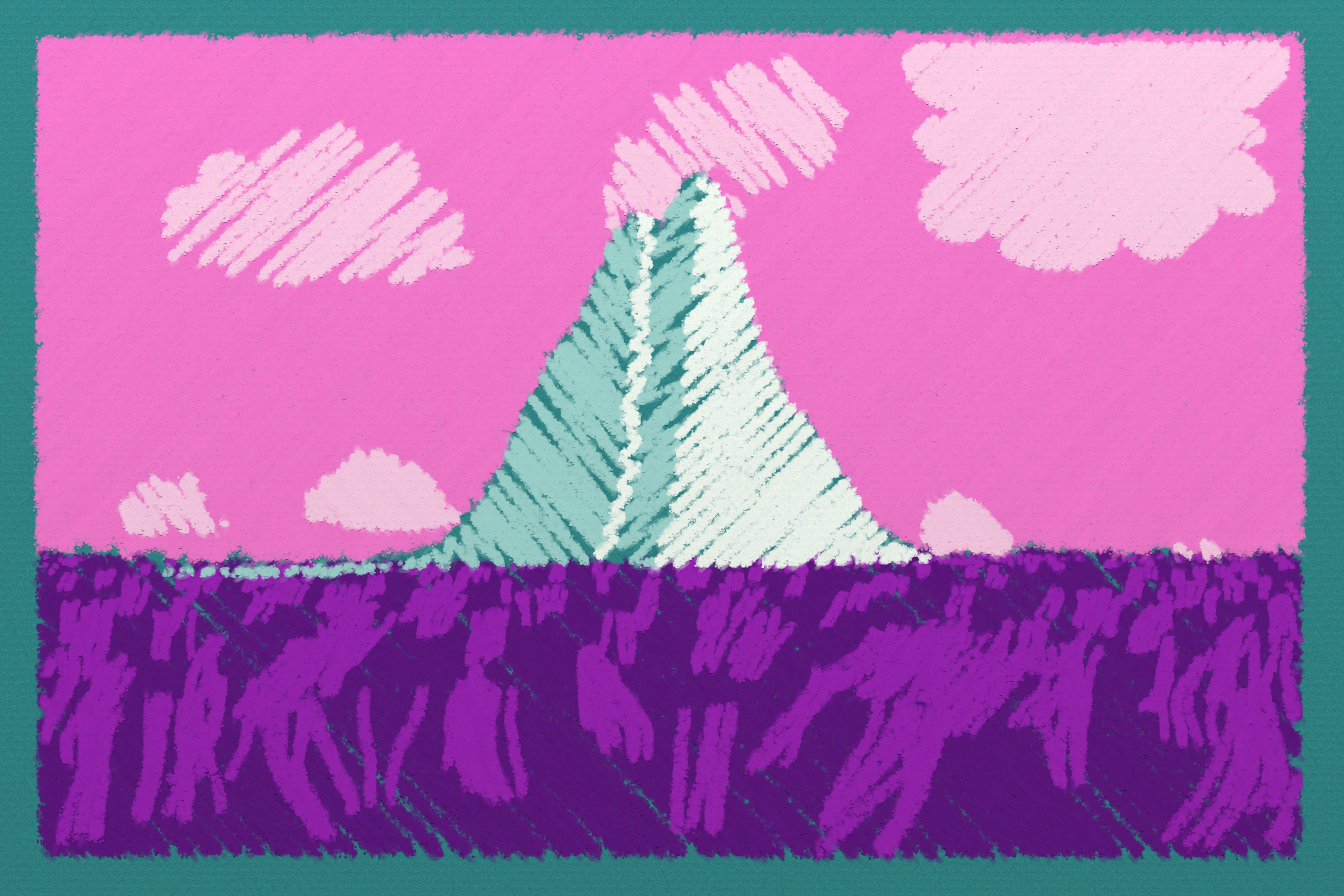 *Arcadia* is a homage to the fridge-worthy landscape art of our youth. Childhood techniques of creating art are re-imagined by the scribbles of a nostalgic, computer-assisted mind.