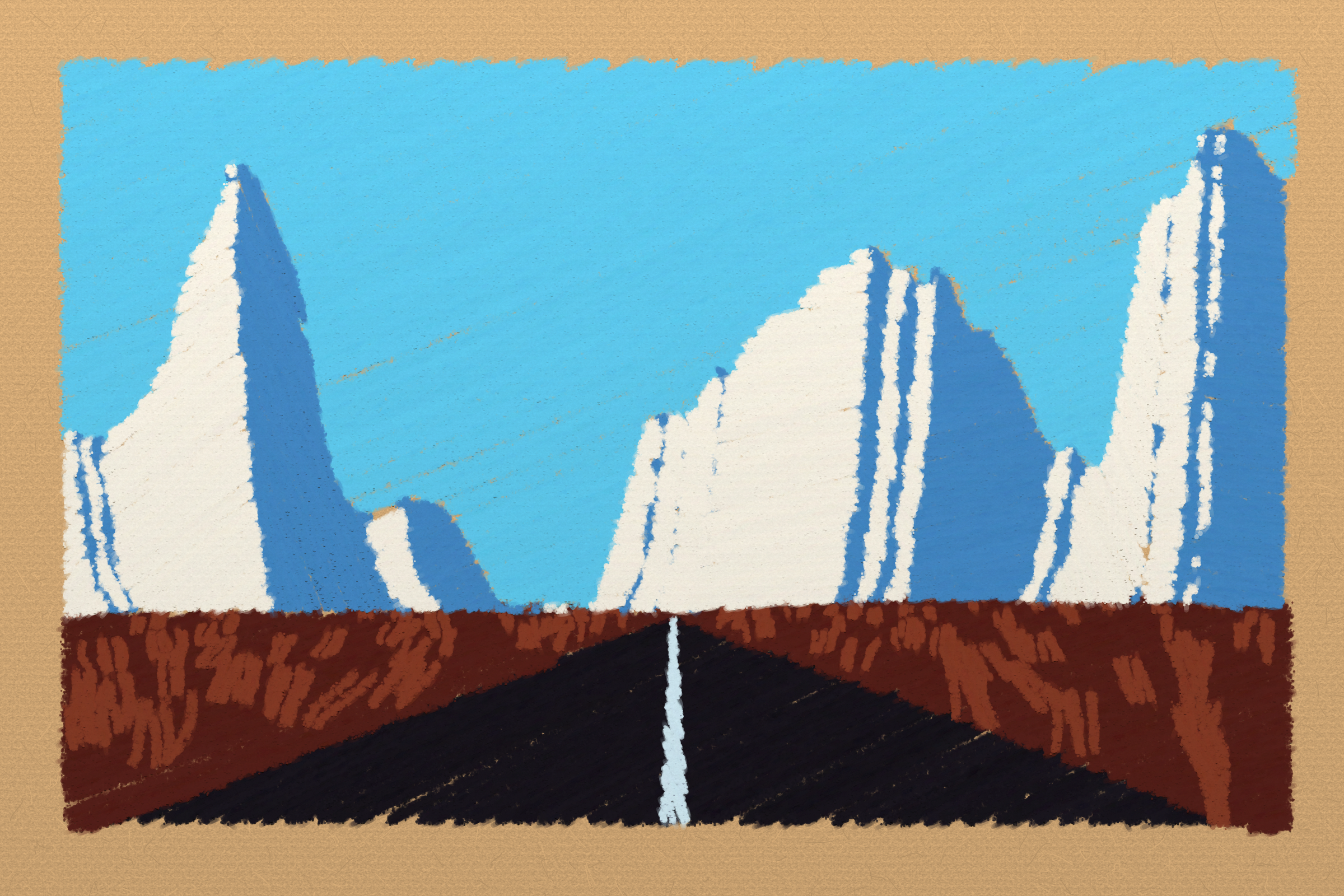*Arcadia* is a homage to the fridge-worthy landscape art of our youth. Childhood techniques of creating art are re-imagined by the scribbles of a nostalgic, computer-assisted mind.