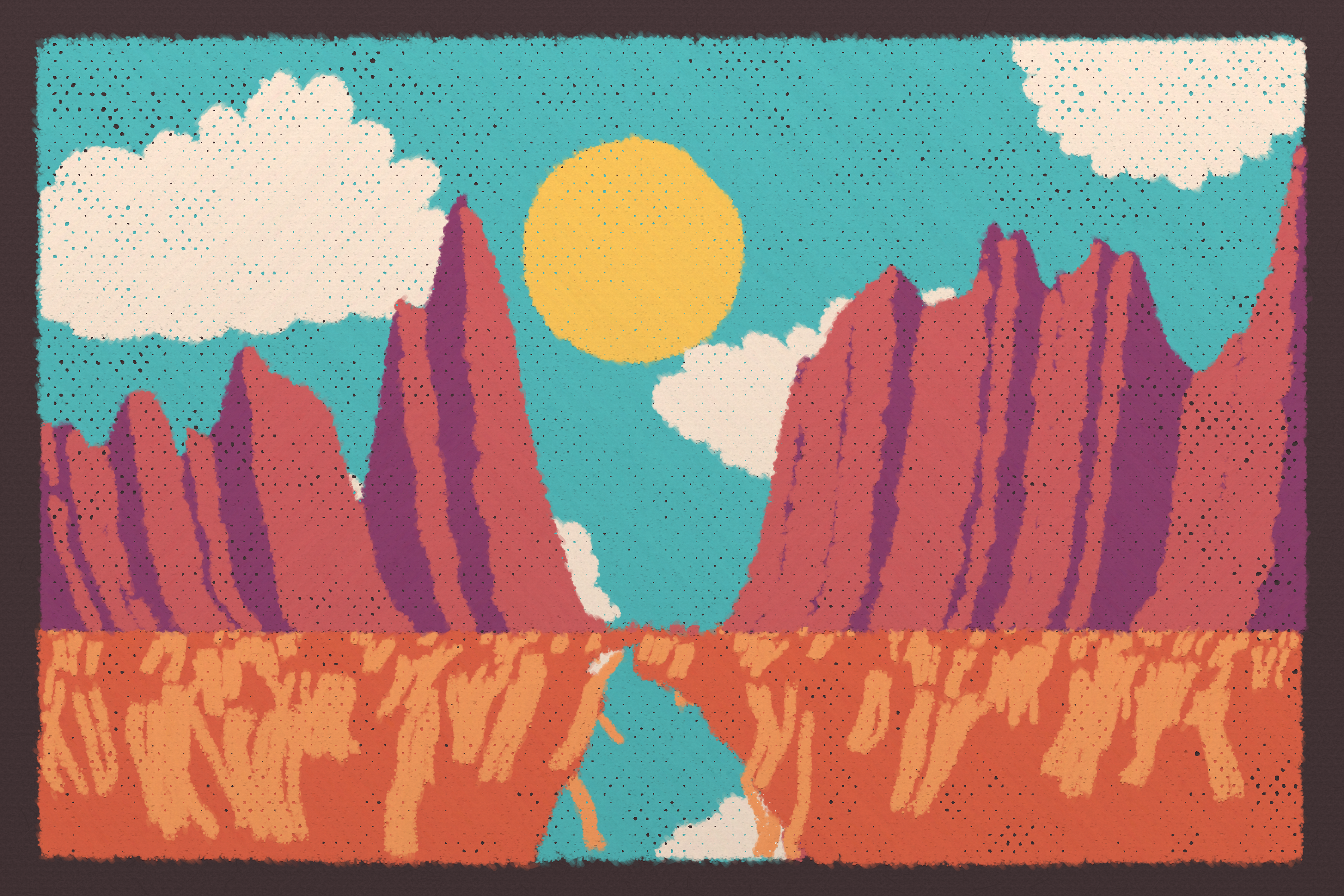 *Arcadia* is a homage to the fridge-worthy landscape art of our youth. Childhood techniques of creating art are re-imagined by the scribbles of a nostalgic, computer-assisted mind.