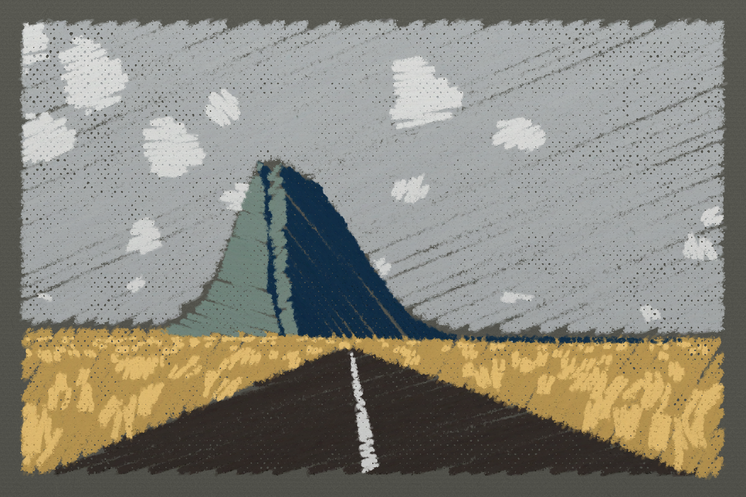 *Arcadia* is a homage to the fridge-worthy landscape art of our youth. Childhood techniques of creating art are re-imagined by the scribbles of a nostalgic, computer-assisted mind.