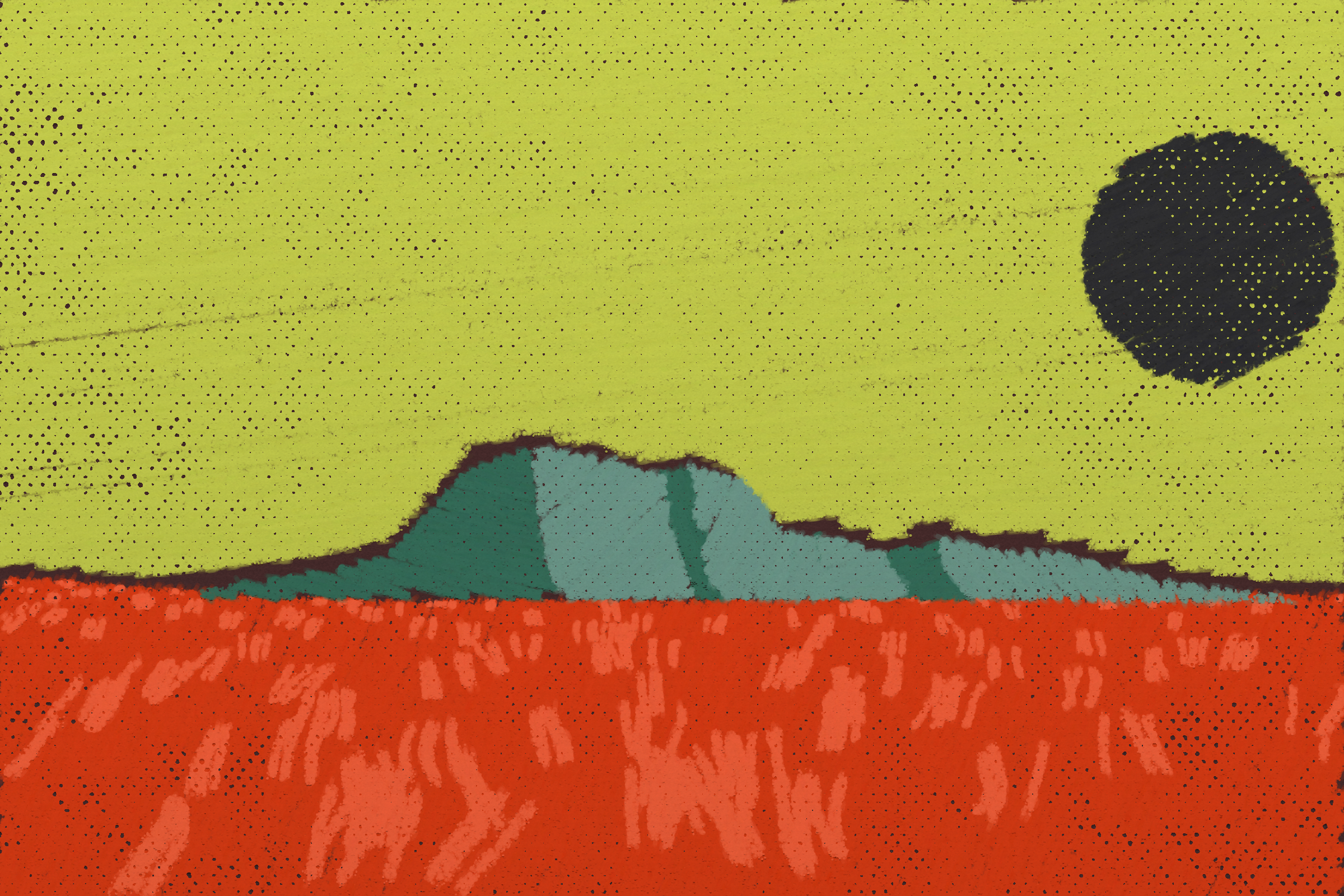 *Arcadia* is a homage to the fridge-worthy landscape art of our youth. Childhood techniques of creating art are re-imagined by the scribbles of a nostalgic, computer-assisted mind.