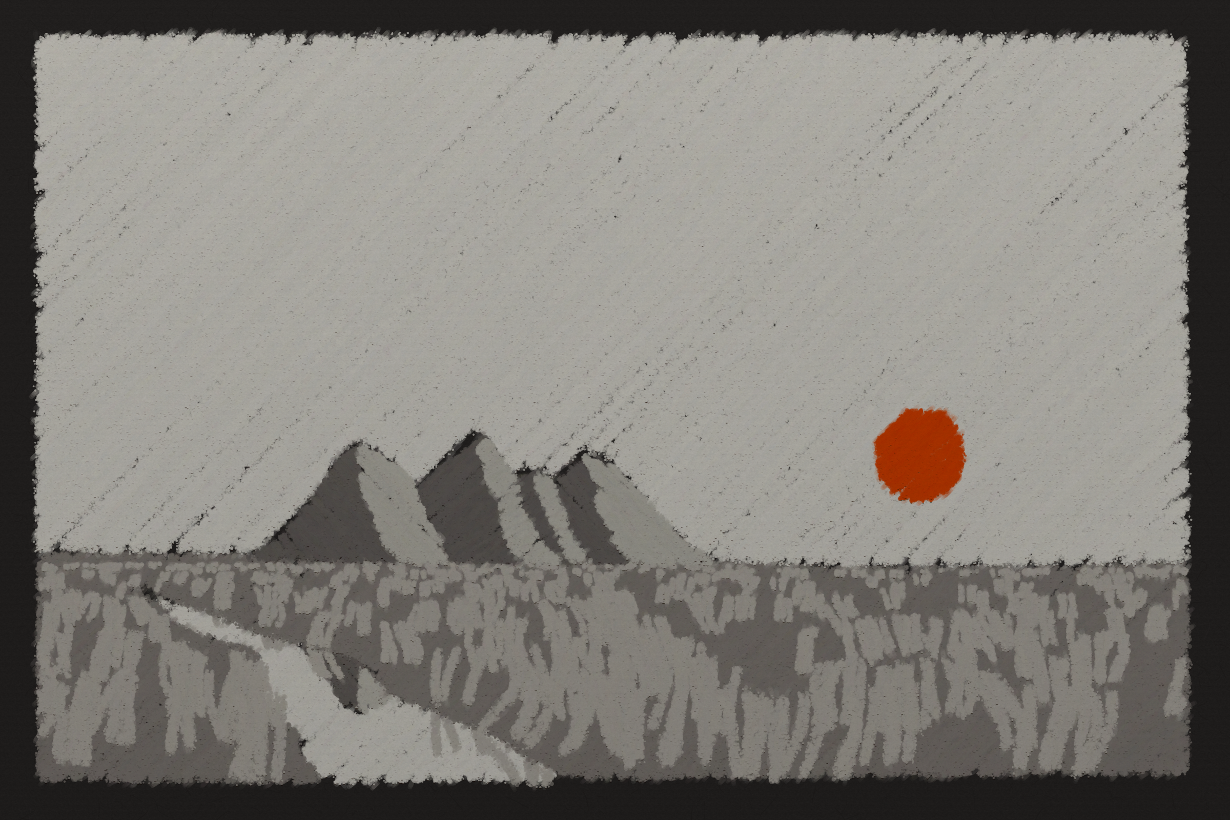 *Arcadia* is a homage to the fridge-worthy landscape art of our youth. Childhood techniques of creating art are re-imagined by the scribbles of a nostalgic, computer-assisted mind.