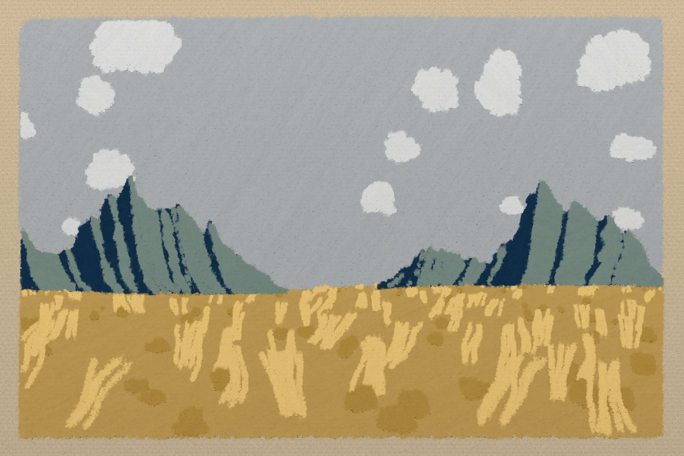 *Arcadia* is a homage to the fridge-worthy landscape art of our youth. Childhood techniques of creating art are re-imagined by the scribbles of a nostalgic, computer-assisted mind.