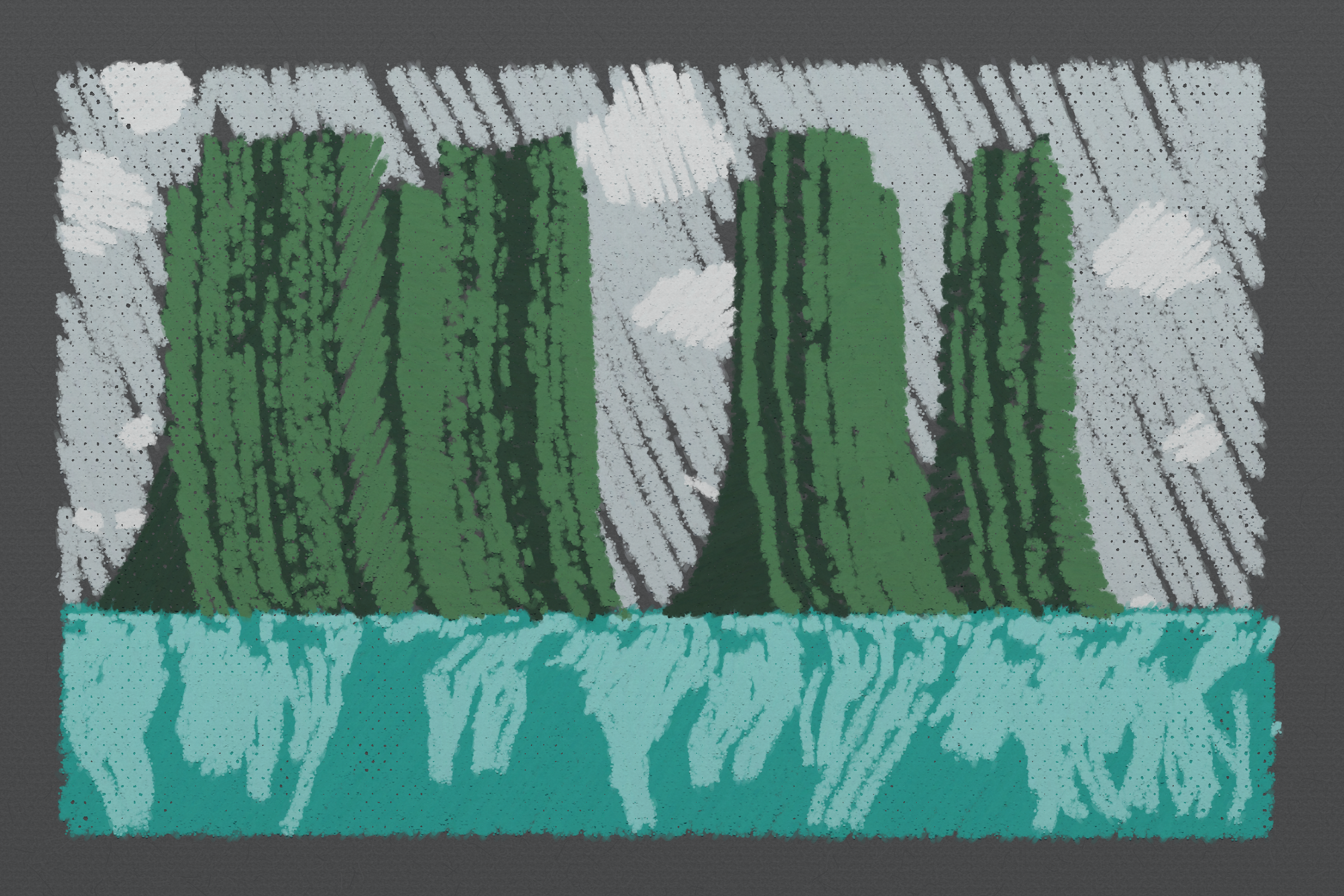 *Arcadia* is a homage to the fridge-worthy landscape art of our youth. Childhood techniques of creating art are re-imagined by the scribbles of a nostalgic, computer-assisted mind.