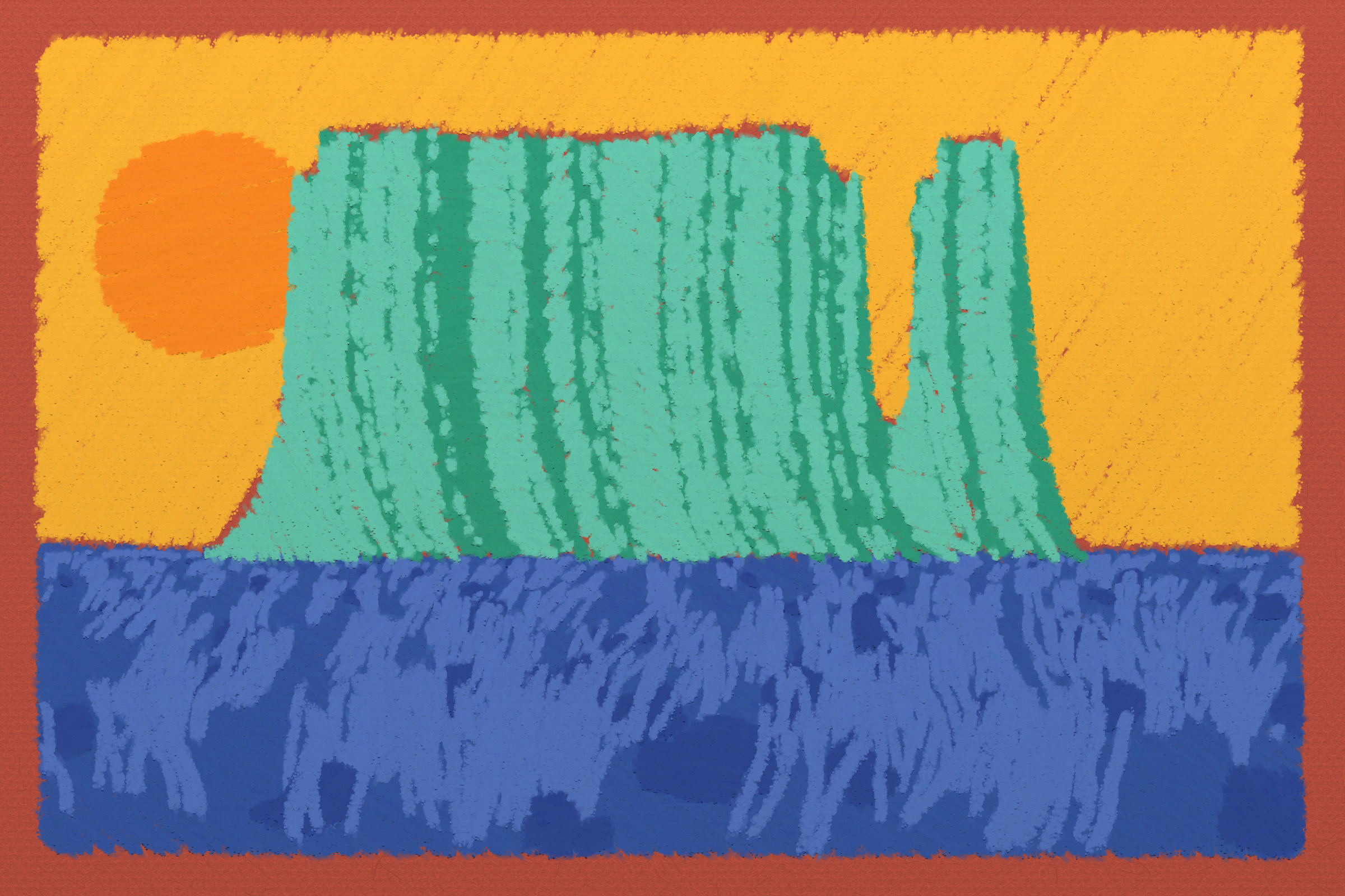 *Arcadia* is a homage to the fridge-worthy landscape art of our youth. Childhood techniques of creating art are re-imagined by the scribbles of a nostalgic, computer-assisted mind.
