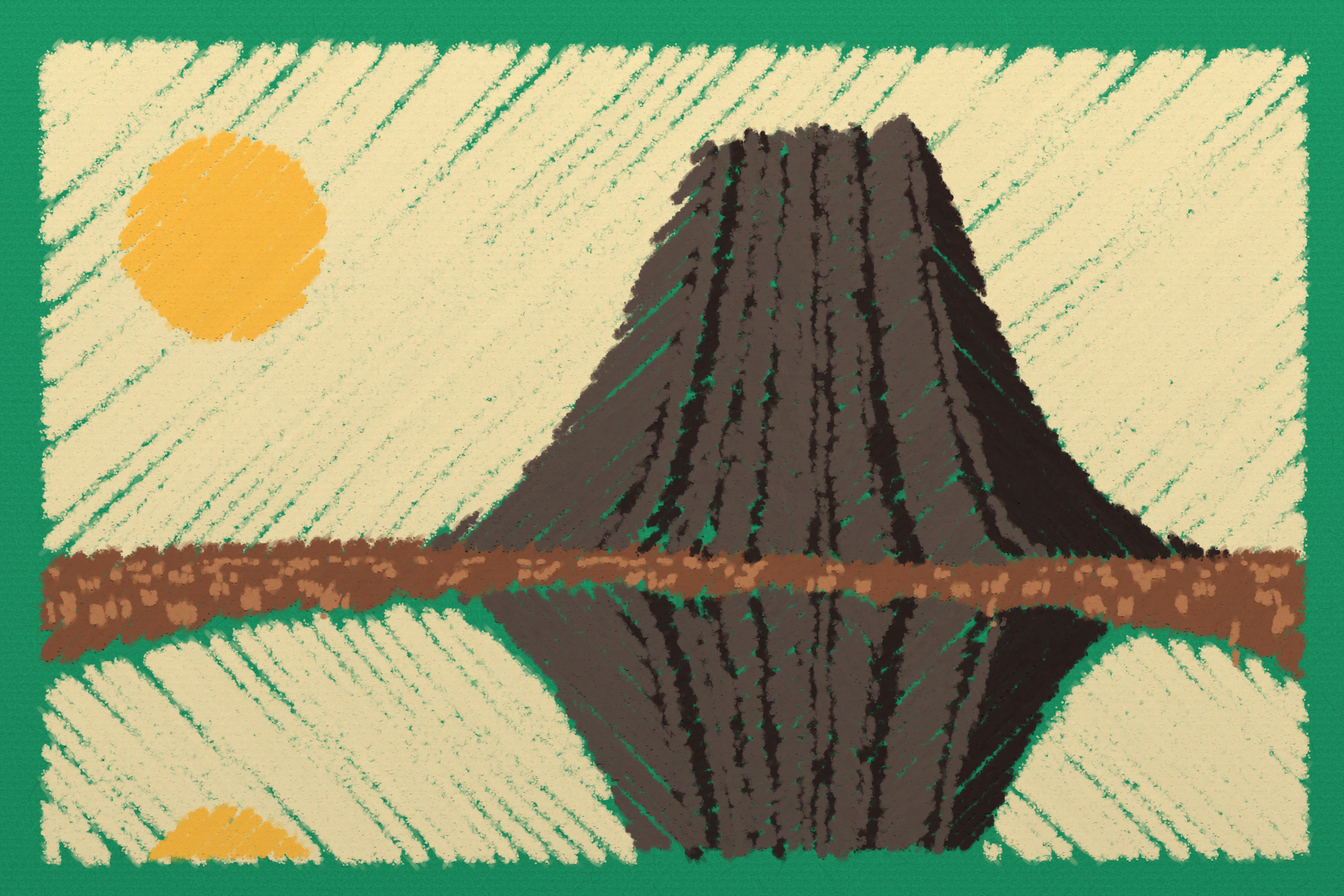 *Arcadia* is a homage to the fridge-worthy landscape art of our youth. Childhood techniques of creating art are re-imagined by the scribbles of a nostalgic, computer-assisted mind.