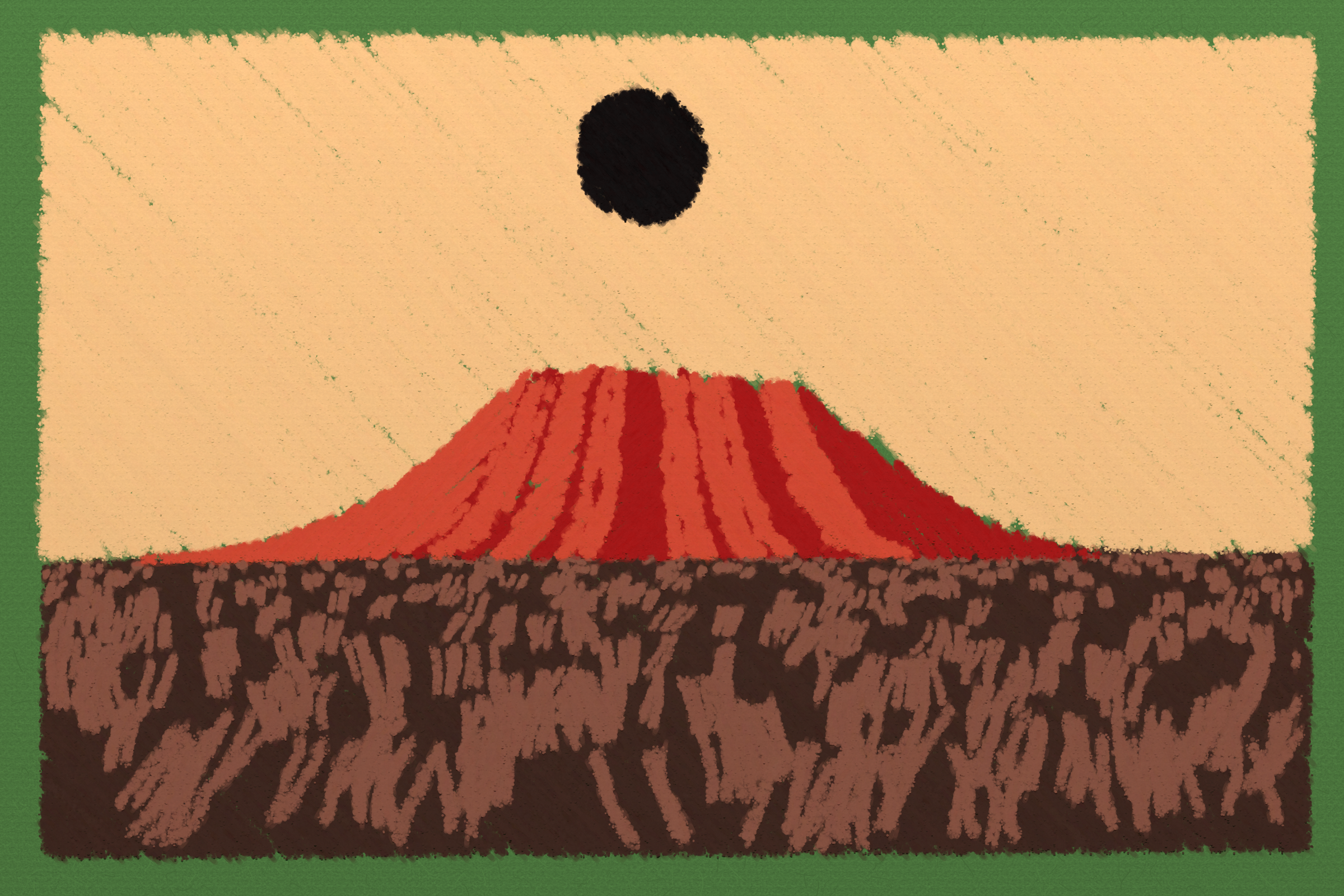 *Arcadia* is a homage to the fridge-worthy landscape art of our youth. Childhood techniques of creating art are re-imagined by the scribbles of a nostalgic, computer-assisted mind.