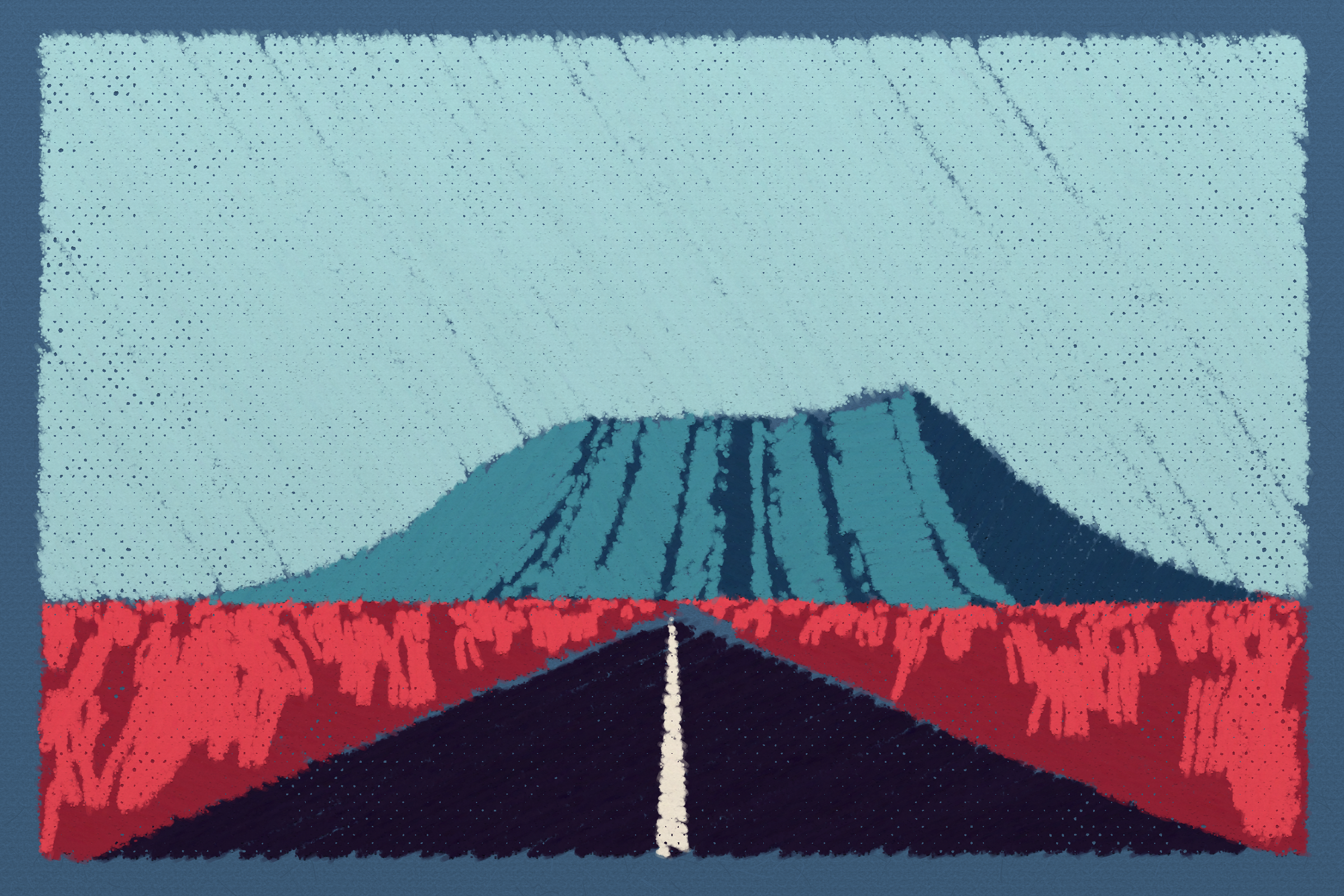 *Arcadia* is a homage to the fridge-worthy landscape art of our youth. Childhood techniques of creating art are re-imagined by the scribbles of a nostalgic, computer-assisted mind.