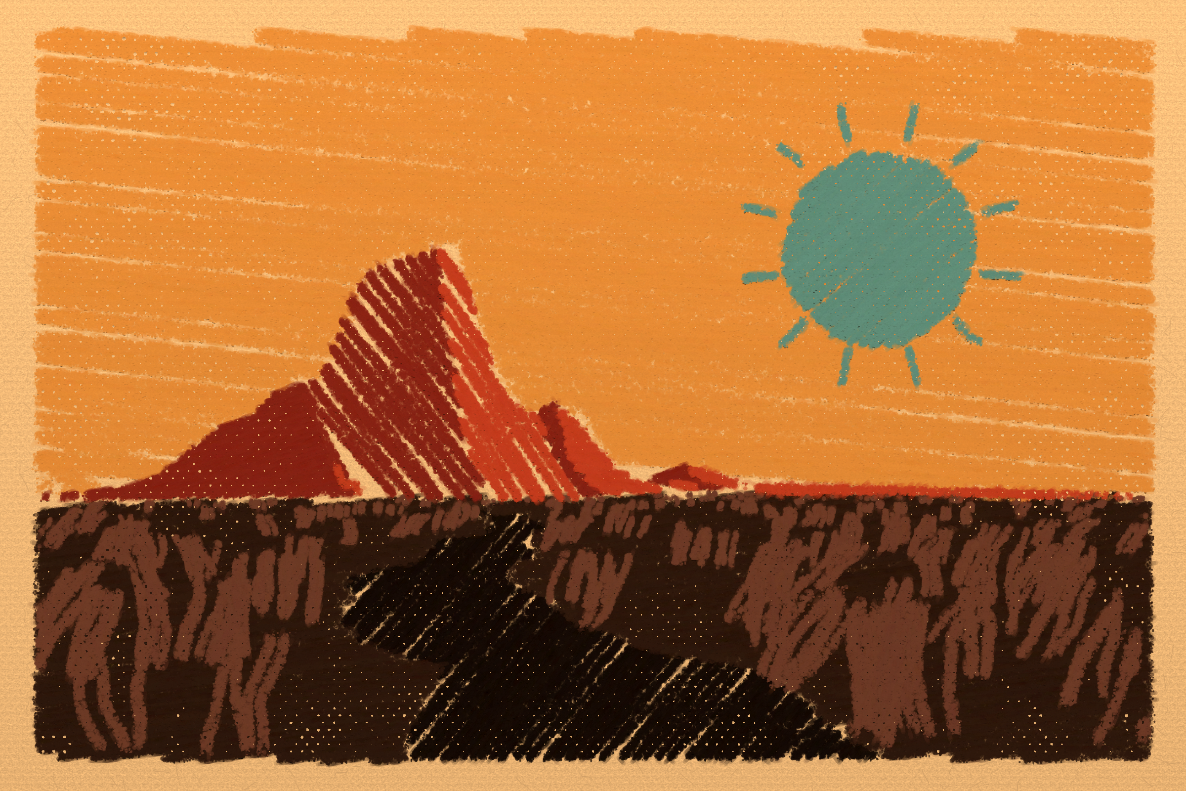 *Arcadia* is a homage to the fridge-worthy landscape art of our youth. Childhood techniques of creating art are re-imagined by the scribbles of a nostalgic, computer-assisted mind.