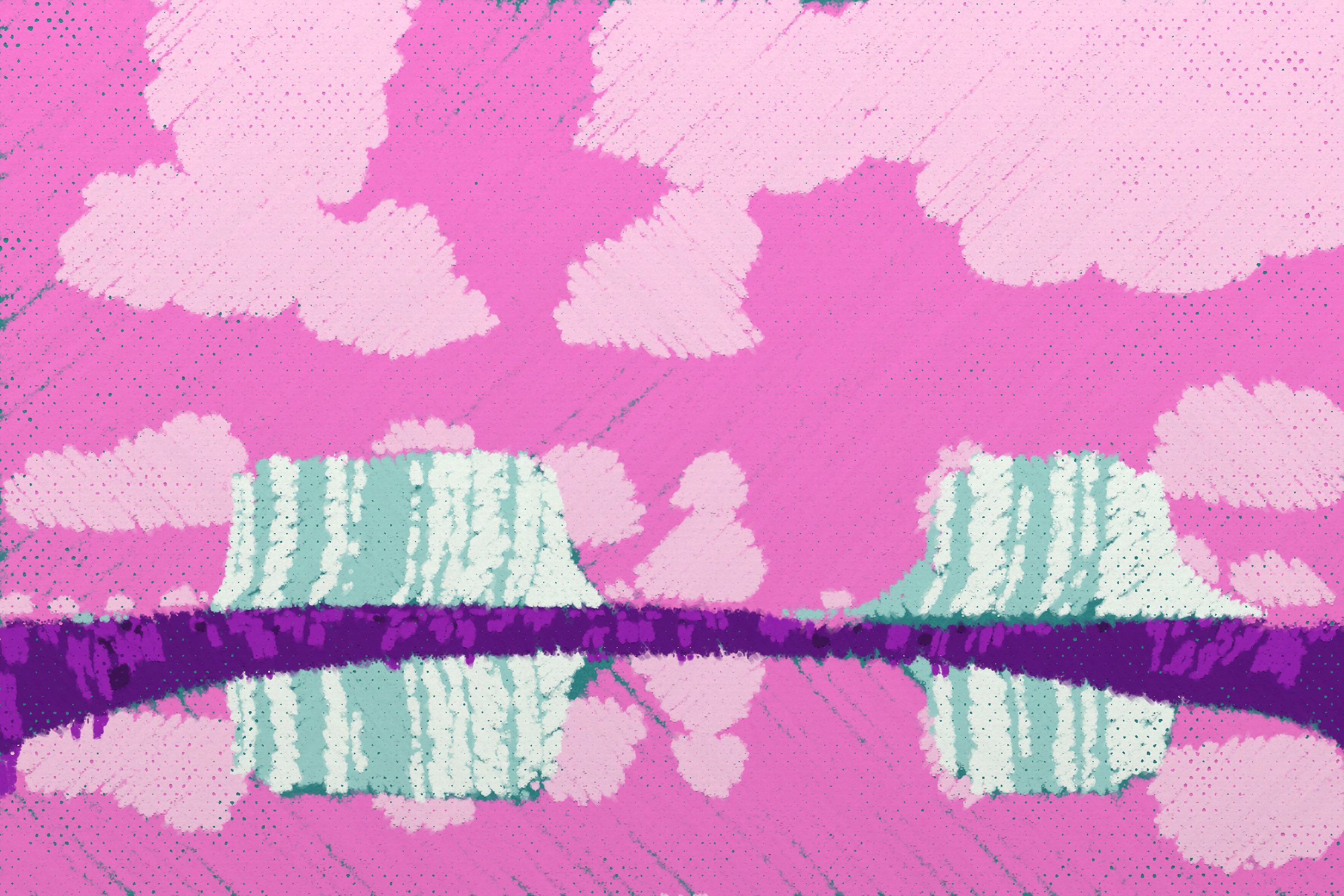 *Arcadia* is a homage to the fridge-worthy landscape art of our youth. Childhood techniques of creating art are re-imagined by the scribbles of a nostalgic, computer-assisted mind.