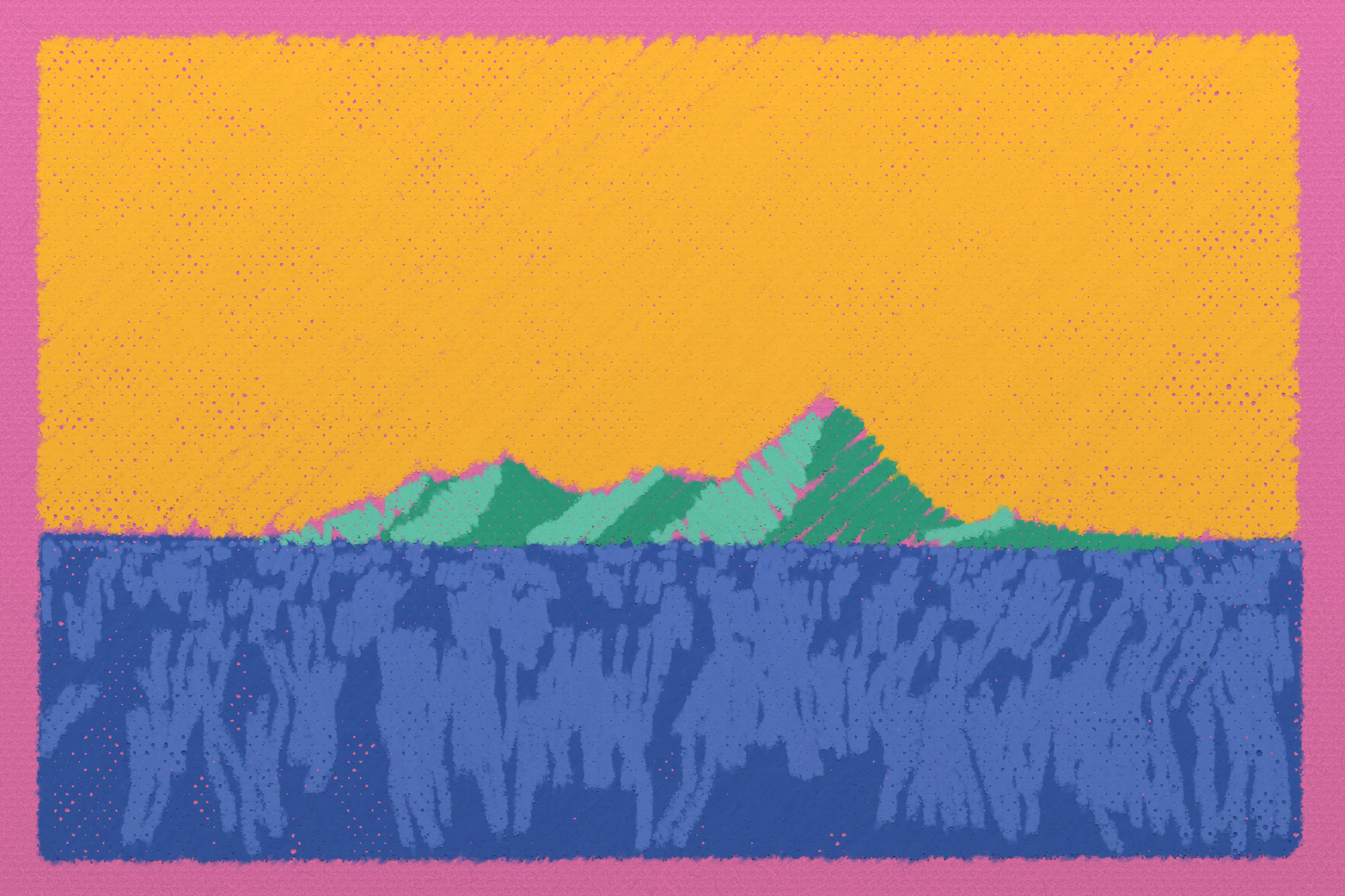 *Arcadia* is a homage to the fridge-worthy landscape art of our youth. Childhood techniques of creating art are re-imagined by the scribbles of a nostalgic, computer-assisted mind.