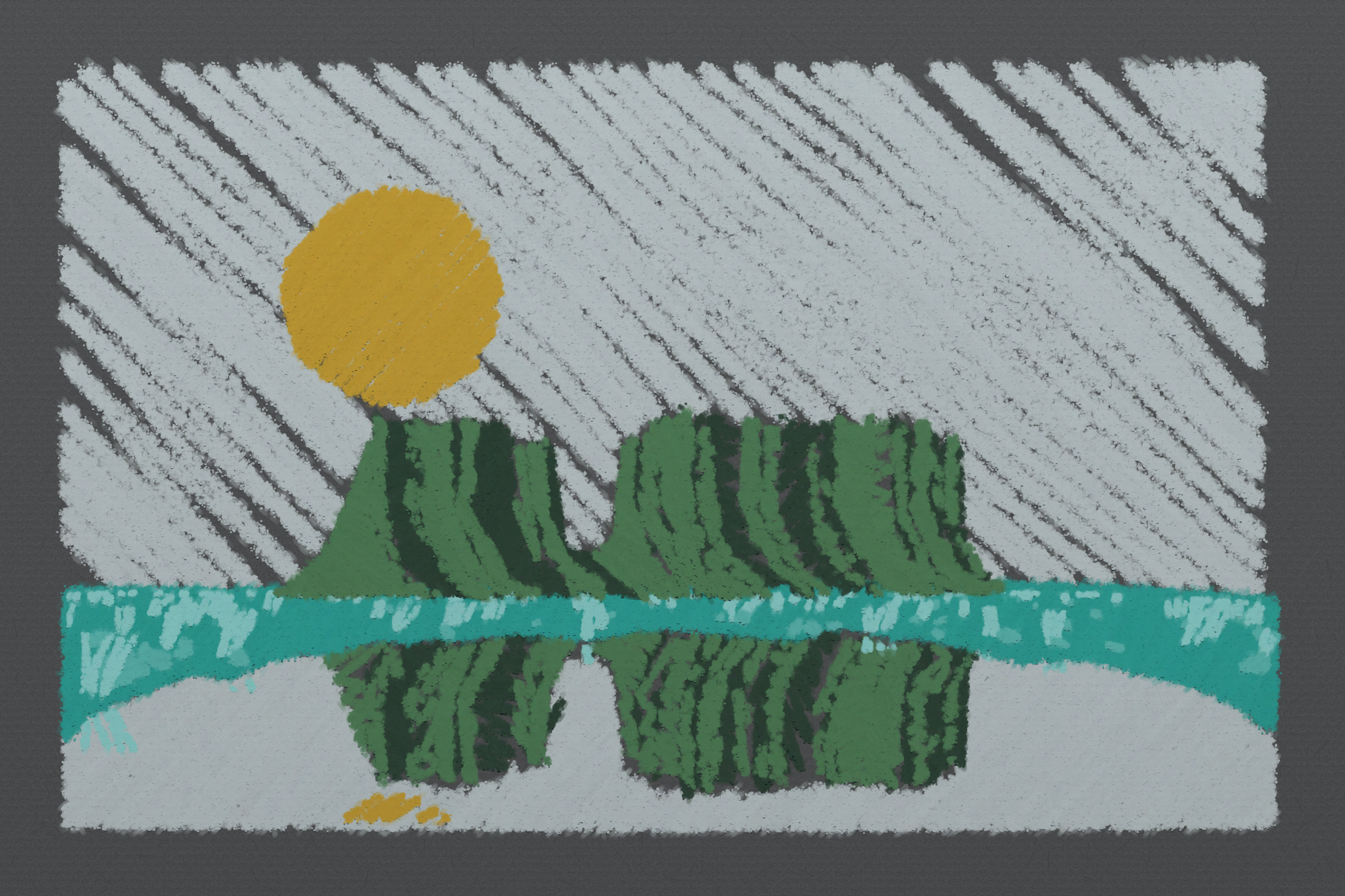 *Arcadia* is a homage to the fridge-worthy landscape art of our youth. Childhood techniques of creating art are re-imagined by the scribbles of a nostalgic, computer-assisted mind.