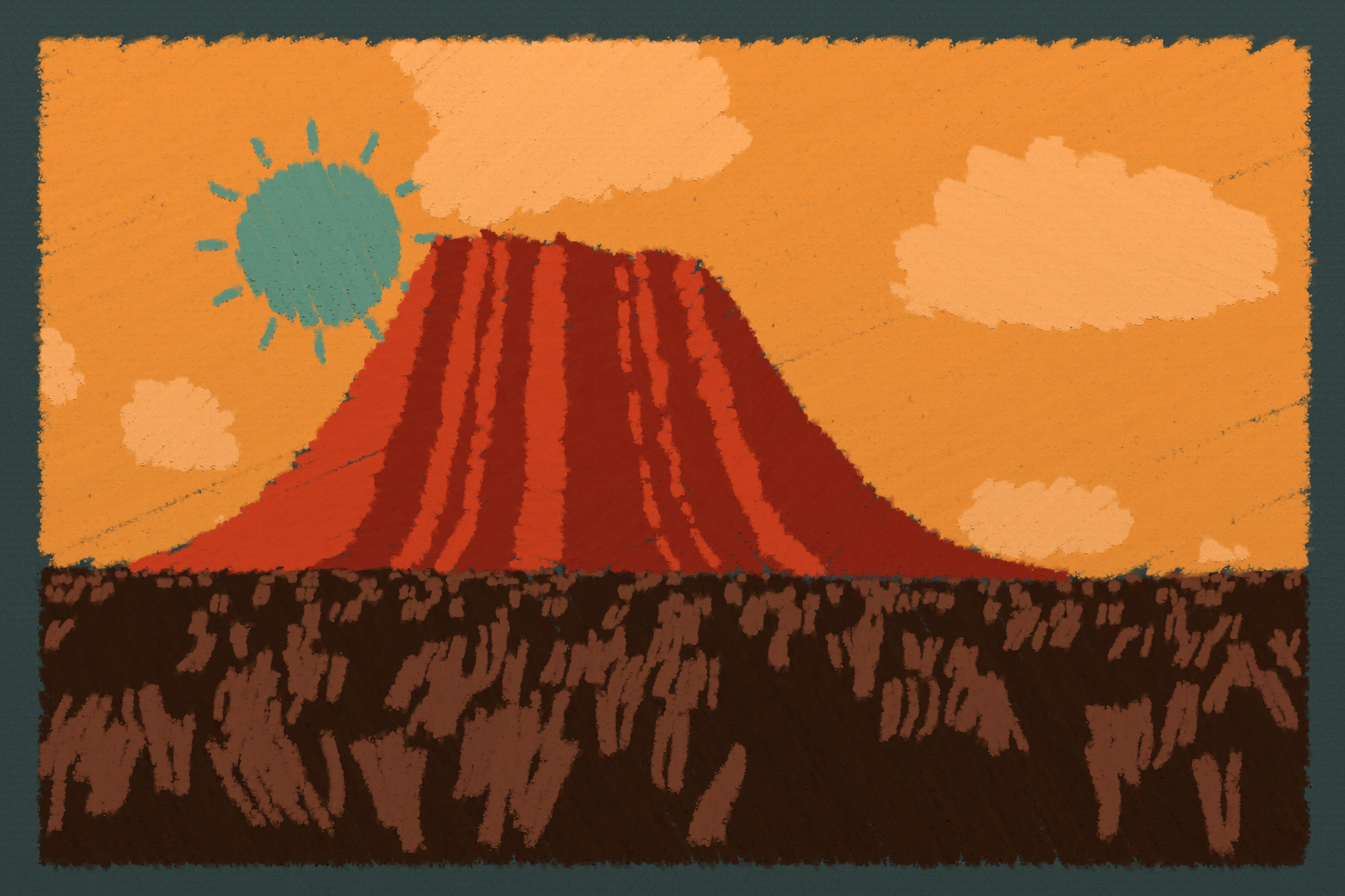 *Arcadia* is a homage to the fridge-worthy landscape art of our youth. Childhood techniques of creating art are re-imagined by the scribbles of a nostalgic, computer-assisted mind.