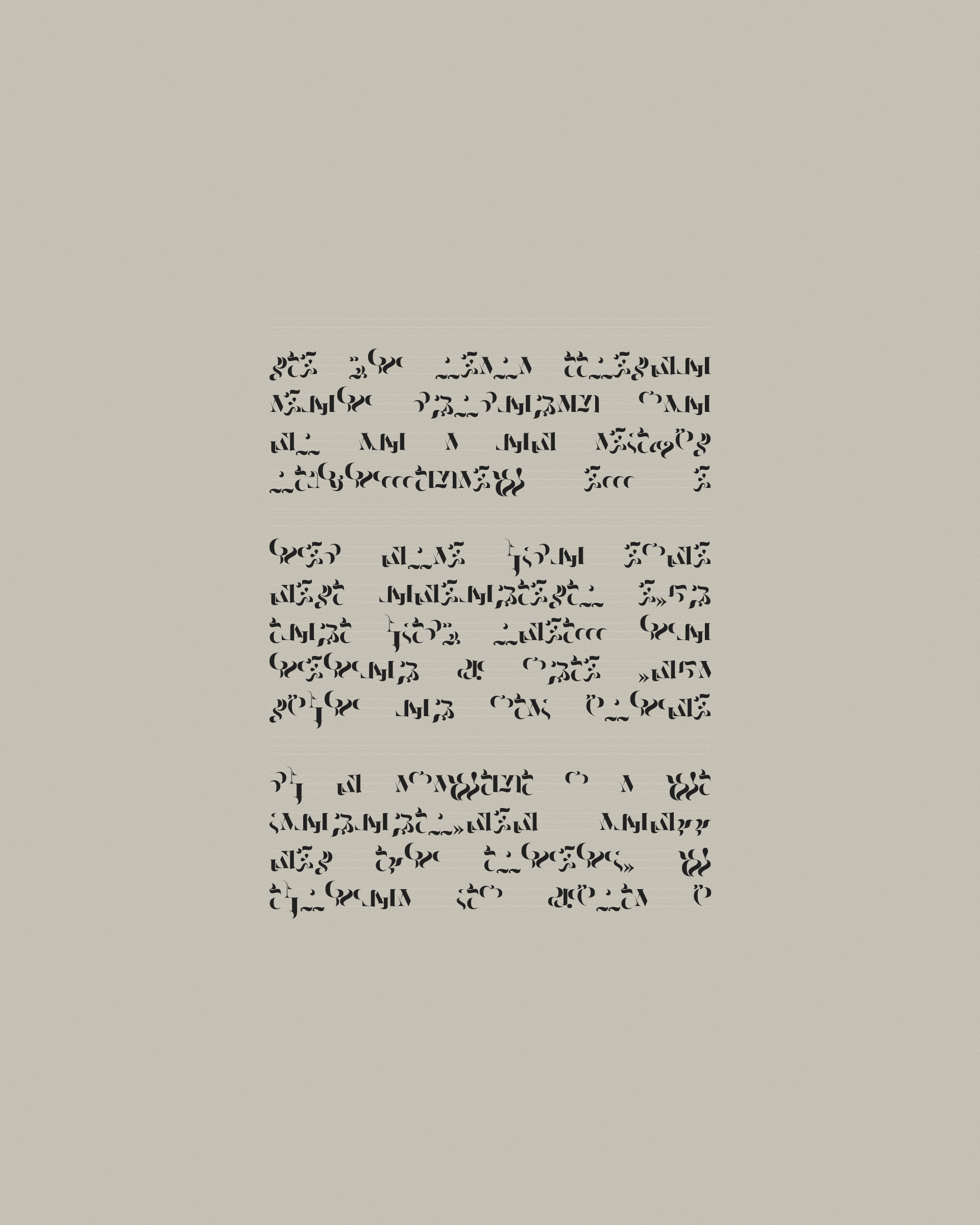 Abstract typographic elements slide together to create new characters. In some compositions, a single character is featured. In others, characters string together to form words and sentences, which the algorithm shapes into often-familiar layouts. // The type designer Gerard Unger said “it is almost impossible to look and read at the same time”. Asemica invites you to look without the burden of legibility. // Created by Emily Edelman, Dima Ofman, and Andrew Badr. Command-S to download a vector file. // Dutch Auction Tiers: 10 / 7 / 5 / 4 / 3.4 / 2.8 / 2.4 / 2 / 1.75 / 1.5 / 1.25 / 1 / 0.75 / 0.5 / 0.25 / 0.1