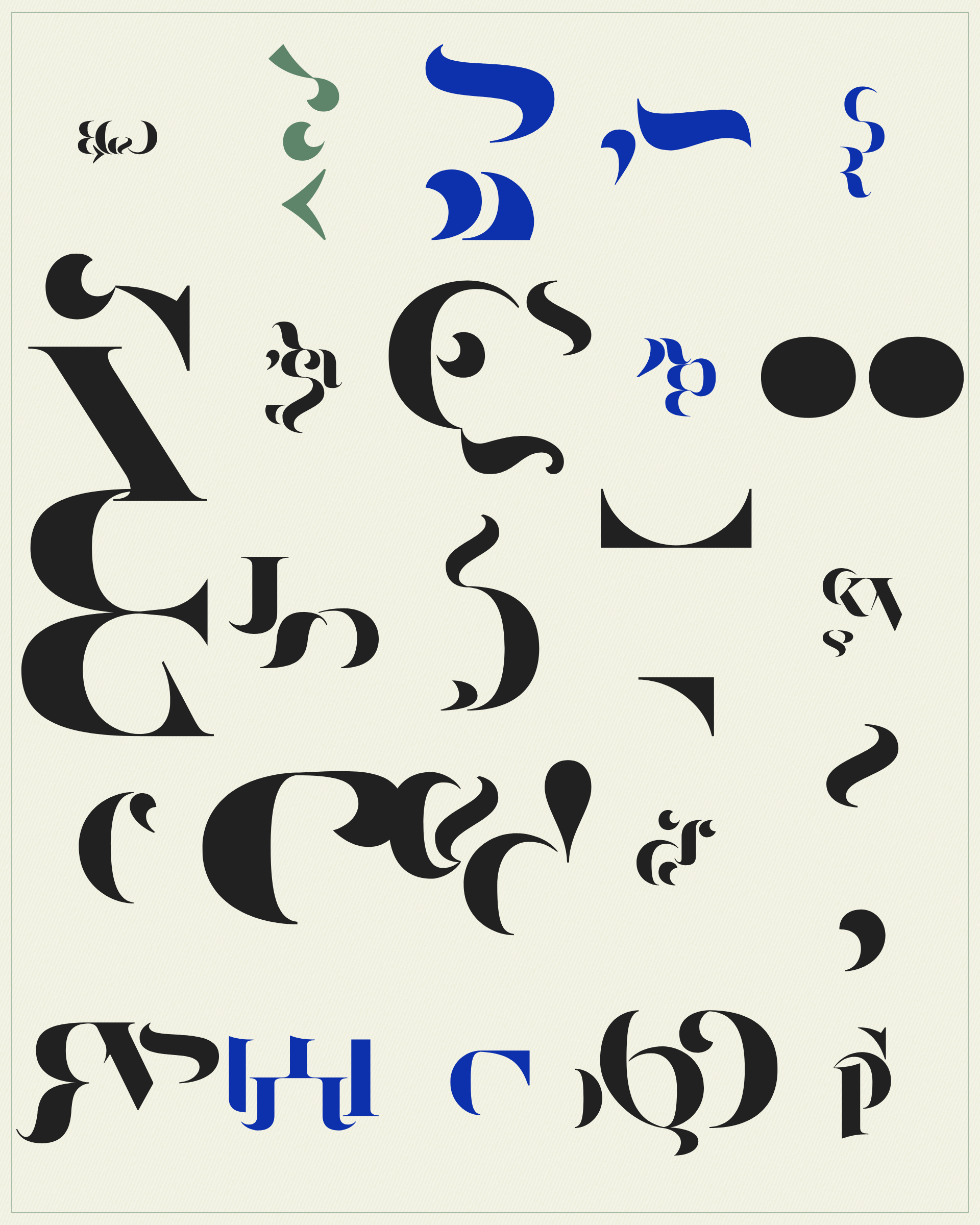 Abstract typographic elements slide together to create new characters. In some compositions, a single character is featured. In others, characters string together to form words and sentences, which the algorithm shapes into often-familiar layouts. // The type designer Gerard Unger said “it is almost impossible to look and read at the same time”. Asemica invites you to look without the burden of legibility. // Created by Emily Edelman, Dima Ofman, and Andrew Badr. Command-S to download a vector file. // Dutch Auction Tiers: 10 / 7 / 5 / 4 / 3.4 / 2.8 / 2.4 / 2 / 1.75 / 1.5 / 1.25 / 1 / 0.75 / 0.5 / 0.25 / 0.1