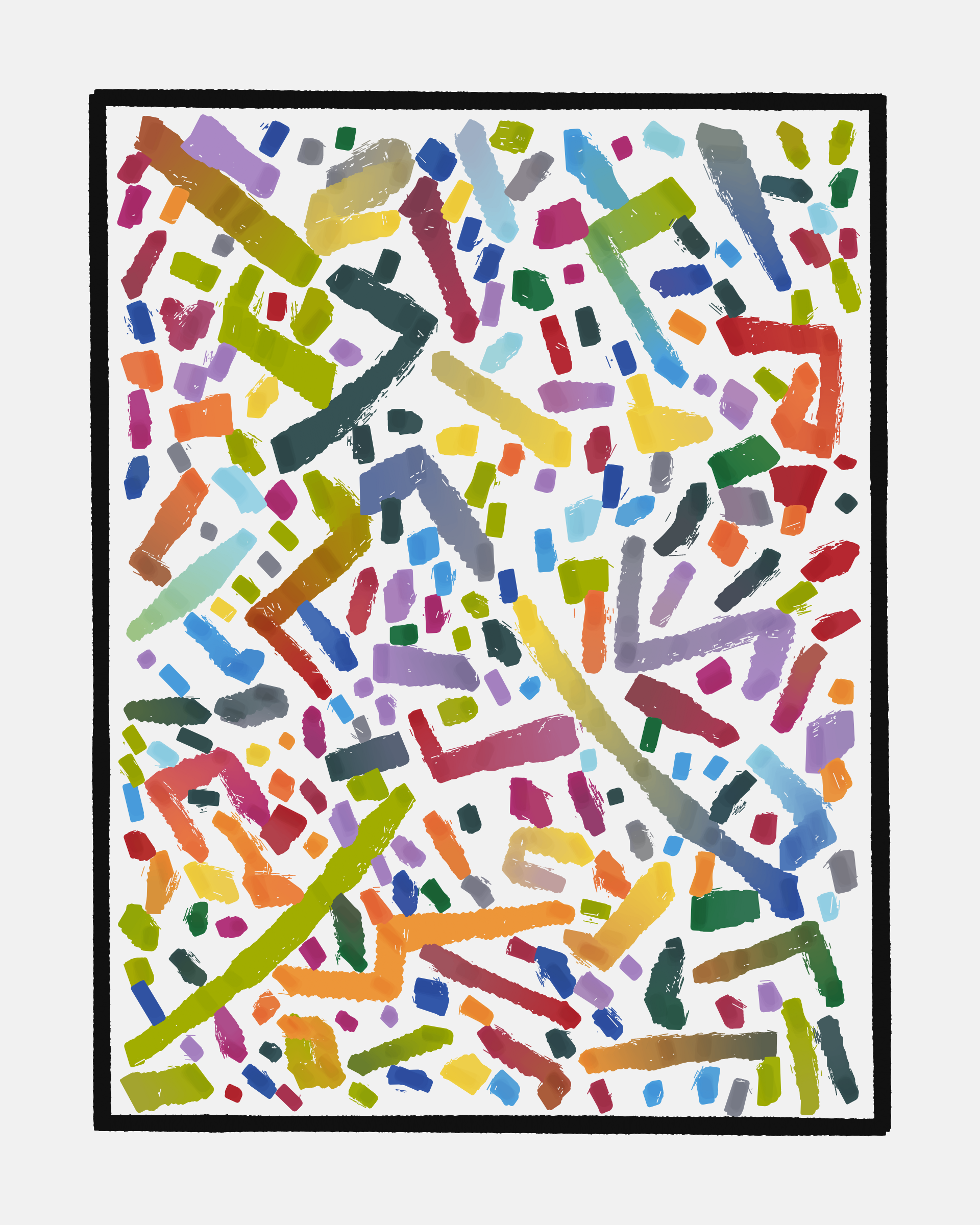 This project explores the age-old computer art phenomenon of inviting the viewer to actively participate in the interpretation of the visual output. The way "Sharp-E" draws the strokes is through a mix of various movements ā irregular curves, straight lines, sudden changes in direction ā in a classic random walk algorithm, while avoiding overlaps with previously drawn strokes. There are no pre-programmed forms per se, but nevertheless it can be common for the viewer to perceive images, symbols, meaning in the generated output.