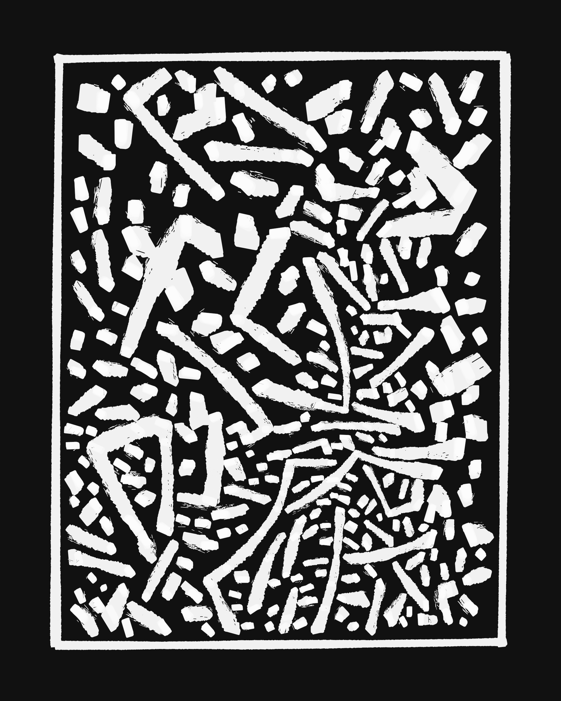 This project explores the age-old computer art phenomenon of inviting the viewer to actively participate in the interpretation of the visual output. The way "Sharp-E" draws the strokes is through a mix of various movements ā irregular curves, straight lines, sudden changes in direction ā in a classic random walk algorithm, while avoiding overlaps with previously drawn strokes. There are no pre-programmed forms per se, but nevertheless it can be common for the viewer to perceive images, symbols, meaning in the generated output.