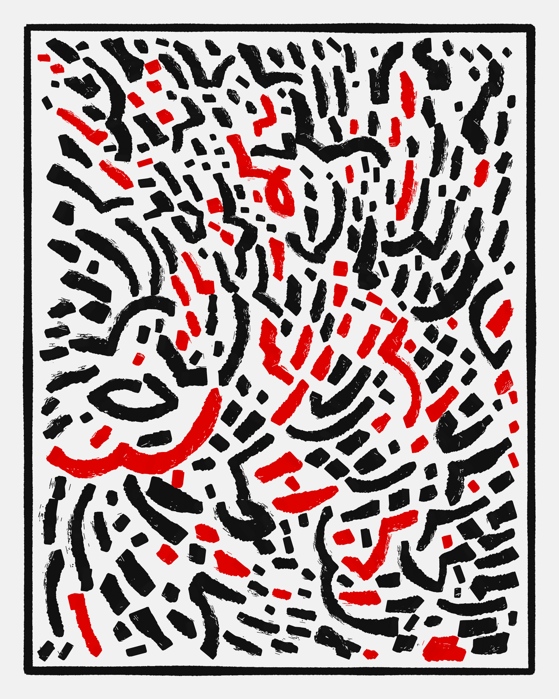 This project explores the age-old computer art phenomenon of inviting the viewer to actively participate in the interpretation of the visual output. The way "Sharp-E" draws the strokes is through a mix of various movements ā irregular curves, straight lines, sudden changes in direction ā in a classic random walk algorithm, while avoiding overlaps with previously drawn strokes. There are no pre-programmed forms per se, but nevertheless it can be common for the viewer to perceive images, symbols, meaning in the generated output.
