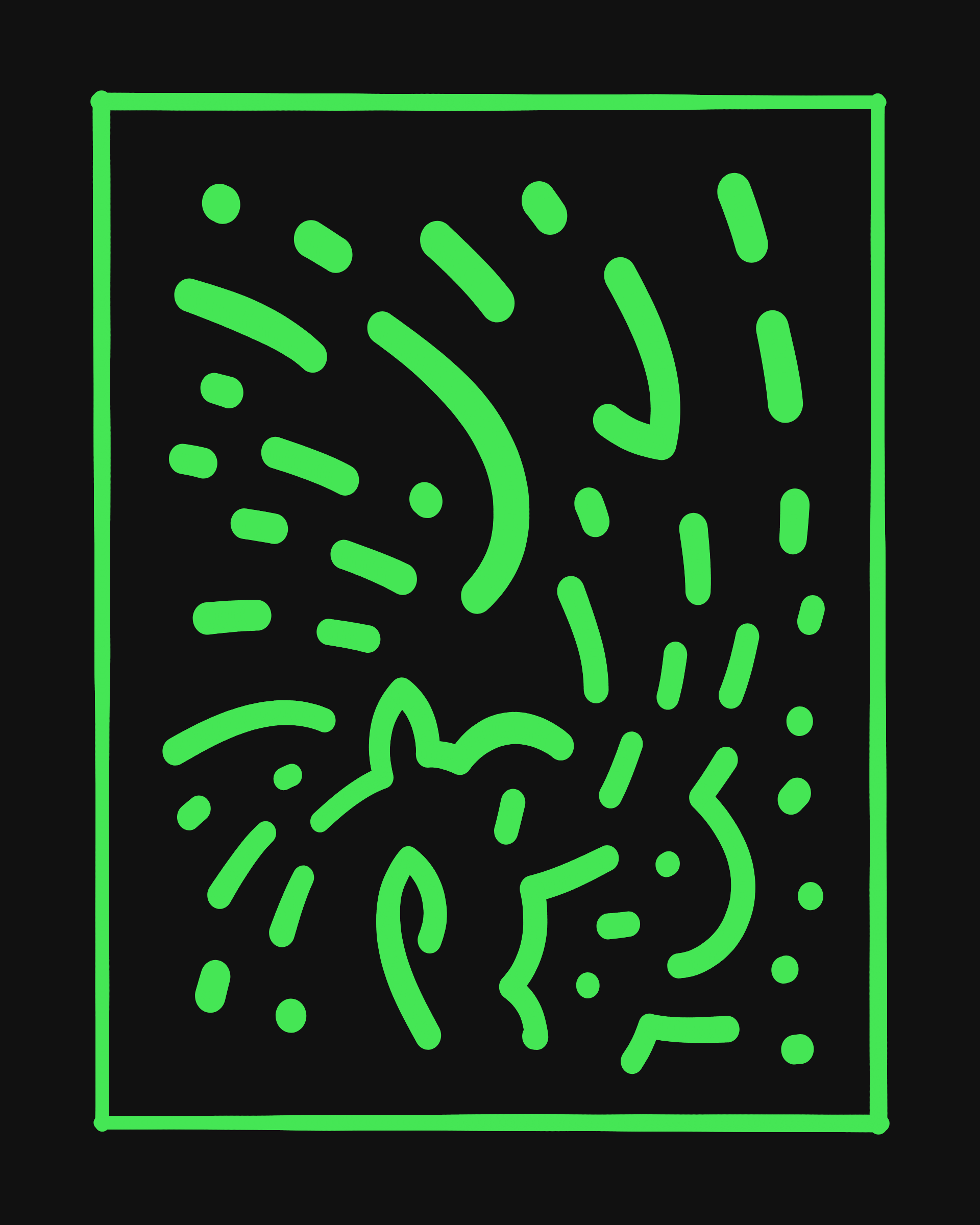 This project explores the age-old computer art phenomenon of inviting the viewer to actively participate in the interpretation of the visual output. The way "Sharp-E" draws the strokes is through a mix of various movements ā irregular curves, straight lines, sudden changes in direction ā in a classic random walk algorithm, while avoiding overlaps with previously drawn strokes. There are no pre-programmed forms per se, but nevertheless it can be common for the viewer to perceive images, symbols, meaning in the generated output.