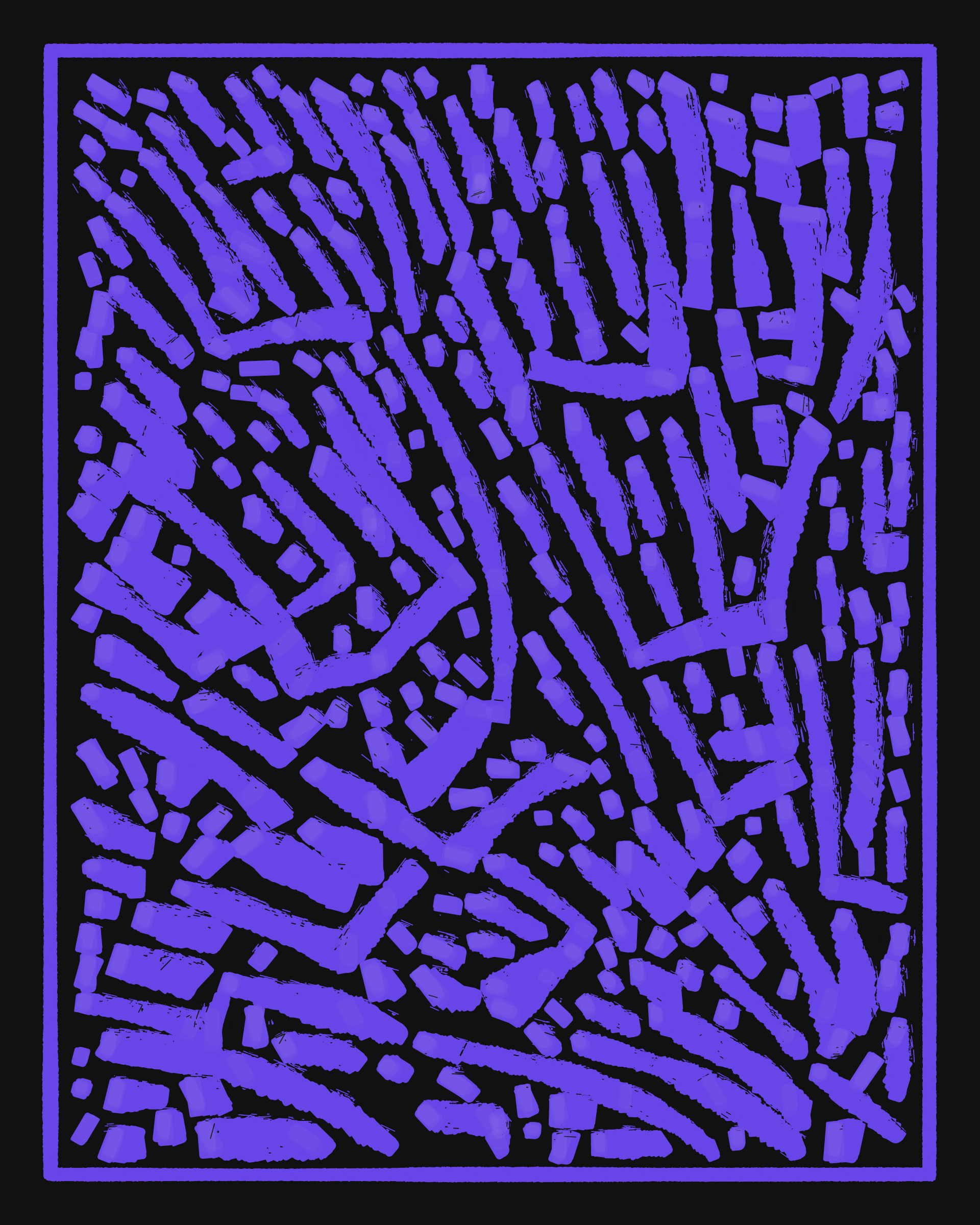 This project explores the age-old computer art phenomenon of inviting the viewer to actively participate in the interpretation of the visual output. The way "Sharp-E" draws the strokes is through a mix of various movements ā irregular curves, straight lines, sudden changes in direction ā in a classic random walk algorithm, while avoiding overlaps with previously drawn strokes. There are no pre-programmed forms per se, but nevertheless it can be common for the viewer to perceive images, symbols, meaning in the generated output.