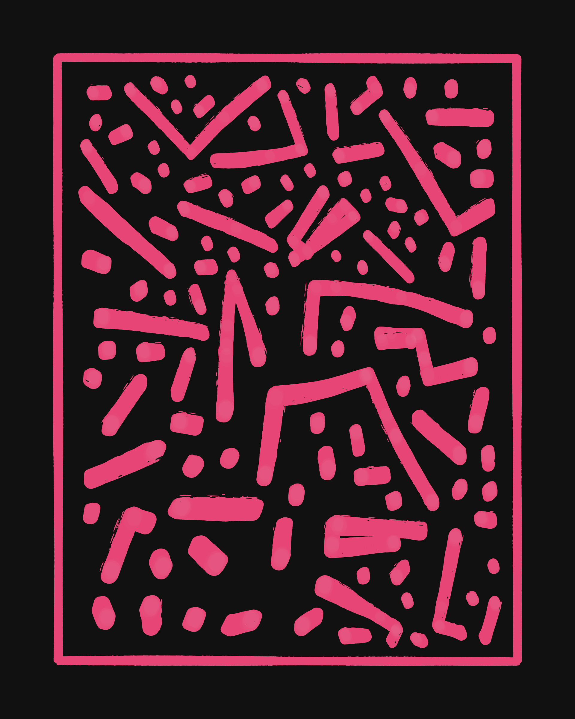 This project explores the age-old computer art phenomenon of inviting the viewer to actively participate in the interpretation of the visual output. The way "Sharp-E" draws the strokes is through a mix of various movements ā irregular curves, straight lines, sudden changes in direction ā in a classic random walk algorithm, while avoiding overlaps with previously drawn strokes. There are no pre-programmed forms per se, but nevertheless it can be common for the viewer to perceive images, symbols, meaning in the generated output.