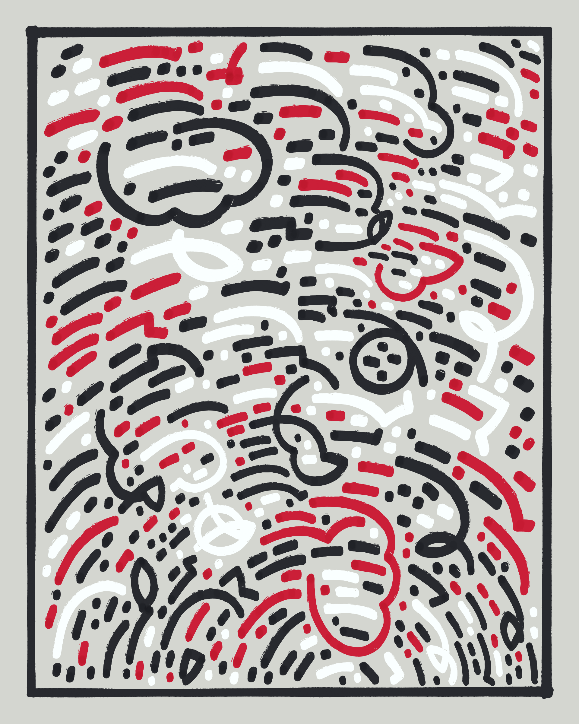 This project explores the age-old computer art phenomenon of inviting the viewer to actively participate in the interpretation of the visual output. The way "Sharp-E" draws the strokes is through a mix of various movements ā irregular curves, straight lines, sudden changes in direction ā in a classic random walk algorithm, while avoiding overlaps with previously drawn strokes. There are no pre-programmed forms per se, but nevertheless it can be common for the viewer to perceive images, symbols, meaning in the generated output.