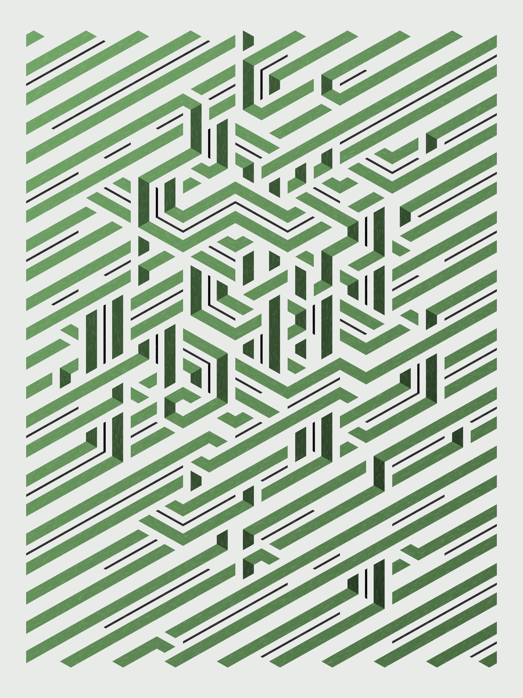 Lines are bent and shaded. There are no wrong turns. [Interaction in live view: press 1-7 or left/right arrow keys to see the stages of sketch construction: 1-grid, 2-divide, 3-tile, 4-bend, 5-shade, 6-color, 7-texture]