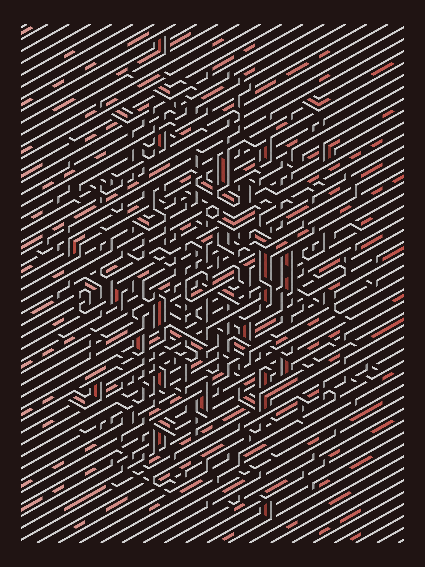 Lines are bent and shaded. There are no wrong turns. [Interaction in live view: press 1-7 or left/right arrow keys to see the stages of sketch construction: 1-grid, 2-divide, 3-tile, 4-bend, 5-shade, 6-color, 7-texture]