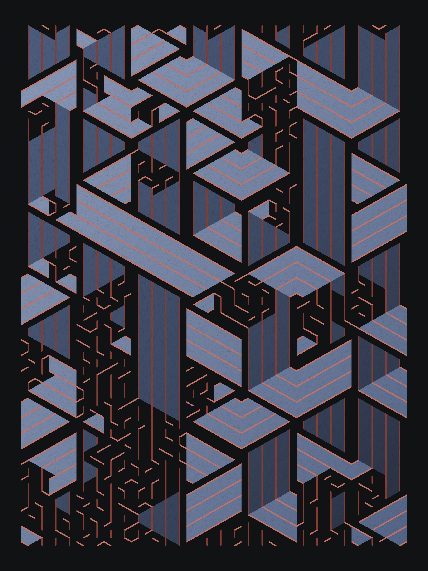 Lines are bent and shaded. There are no wrong turns. [Interaction in live view: press 1-7 or left/right arrow keys to see the stages of sketch construction: 1-grid, 2-divide, 3-tile, 4-bend, 5-shade, 6-color, 7-texture]
