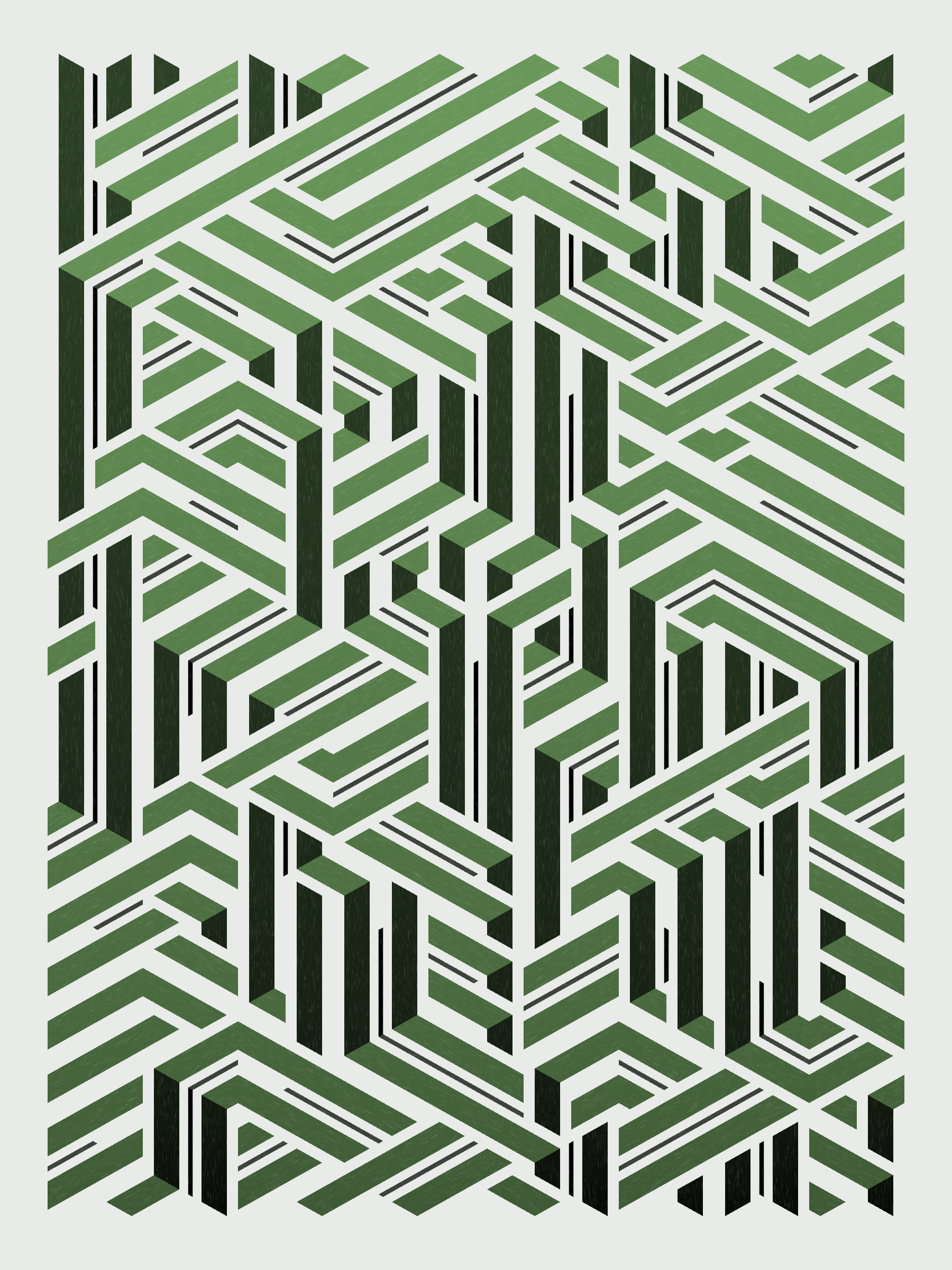 Lines are bent and shaded. There are no wrong turns. [Interaction in live view: press 1-7 or left/right arrow keys to see the stages of sketch construction: 1-grid, 2-divide, 3-tile, 4-bend, 5-shade, 6-color, 7-texture]