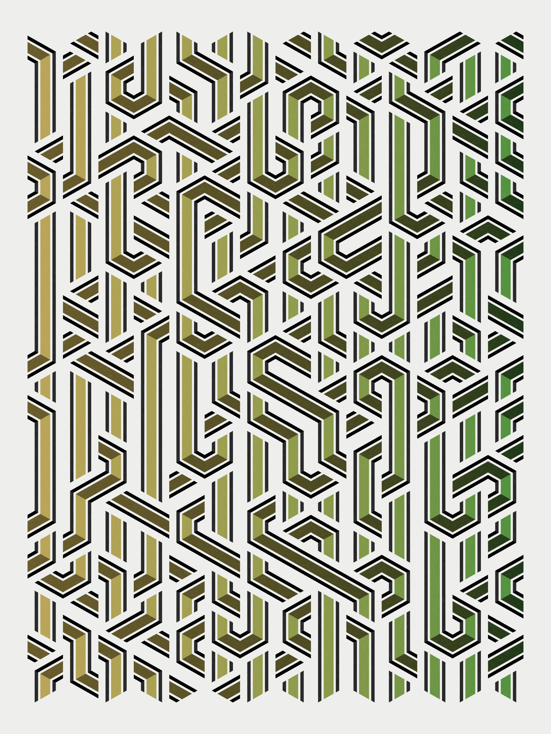 Lines are bent and shaded. There are no wrong turns. [Interaction in live view: press 1-7 or left/right arrow keys to see the stages of sketch construction: 1-grid, 2-divide, 3-tile, 4-bend, 5-shade, 6-color, 7-texture]