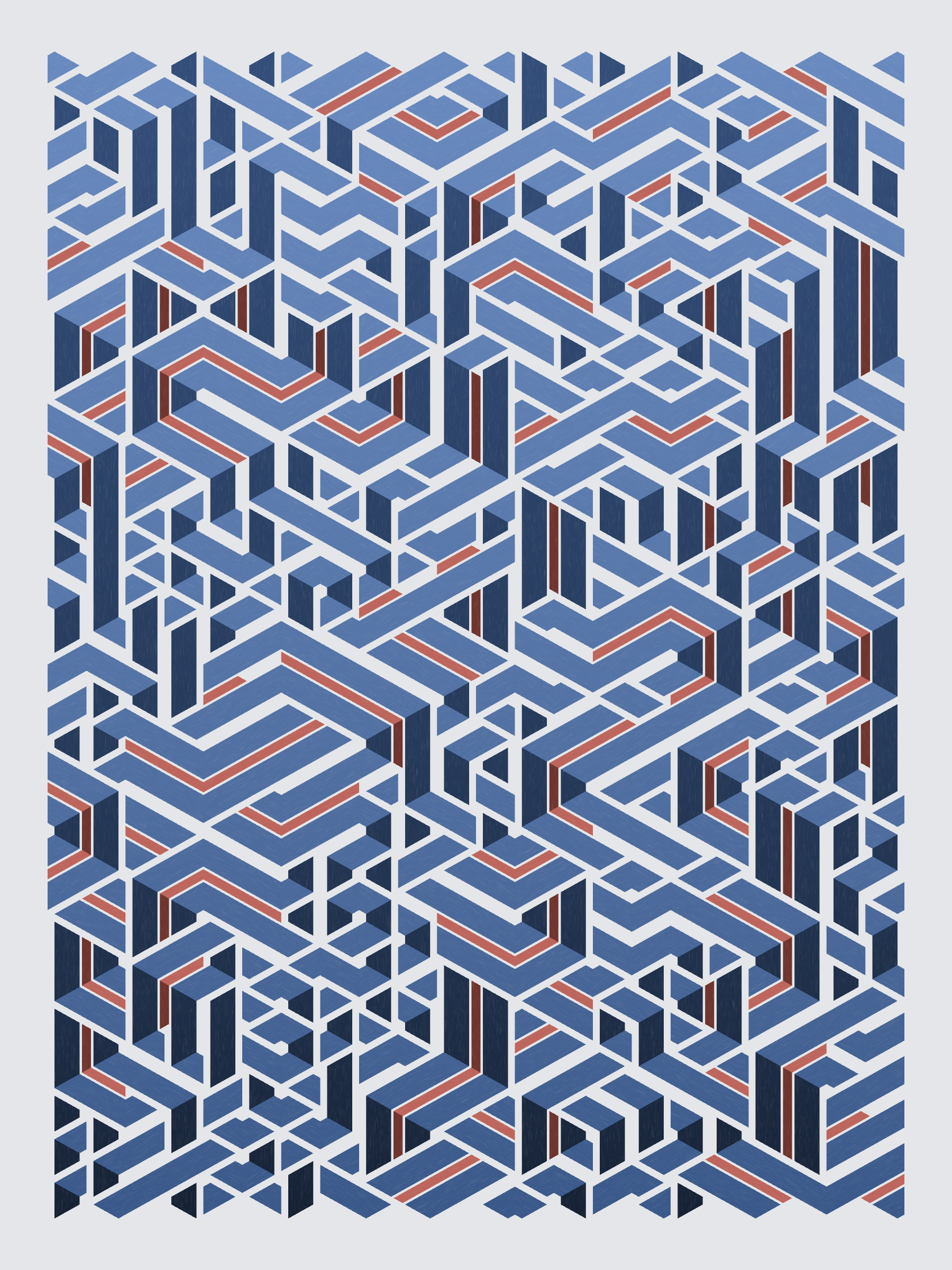 Lines are bent and shaded. There are no wrong turns. [Interaction in live view: press 1-7 or left/right arrow keys to see the stages of sketch construction: 1-grid, 2-divide, 3-tile, 4-bend, 5-shade, 6-color, 7-texture]