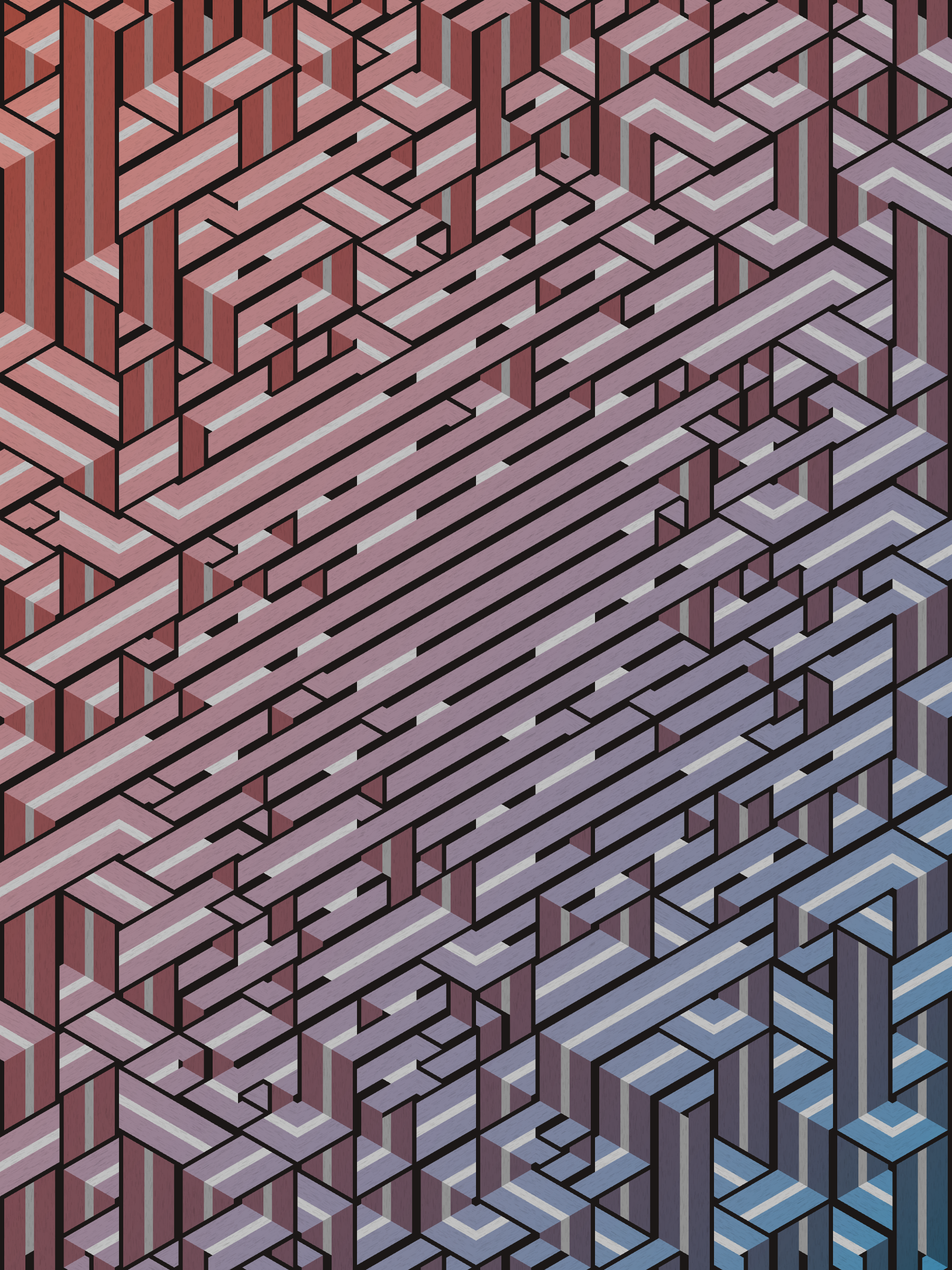 Lines are bent and shaded. There are no wrong turns. [Interaction in live view: press 1-7 or left/right arrow keys to see the stages of sketch construction: 1-grid, 2-divide, 3-tile, 4-bend, 5-shade, 6-color, 7-texture]