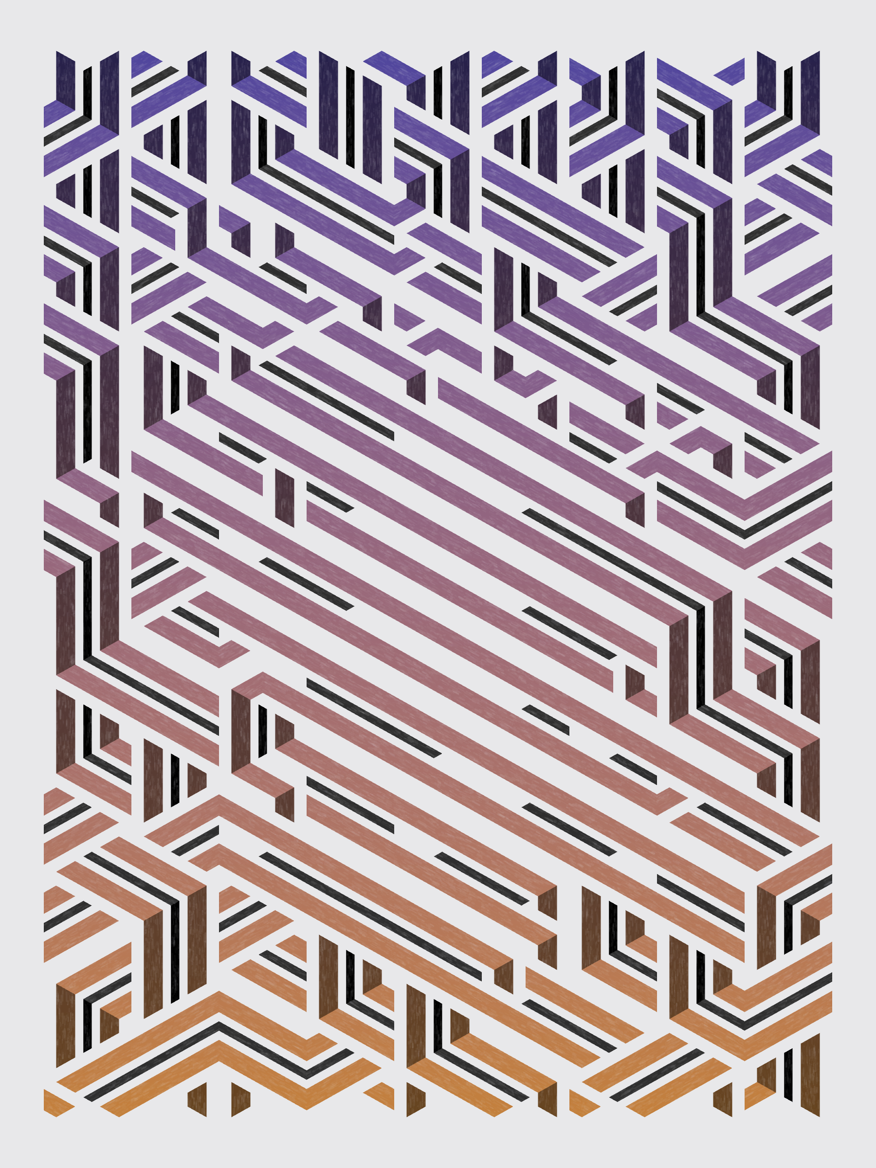 Lines are bent and shaded. There are no wrong turns. [Interaction in live view: press 1-7 or left/right arrow keys to see the stages of sketch construction: 1-grid, 2-divide, 3-tile, 4-bend, 5-shade, 6-color, 7-texture]