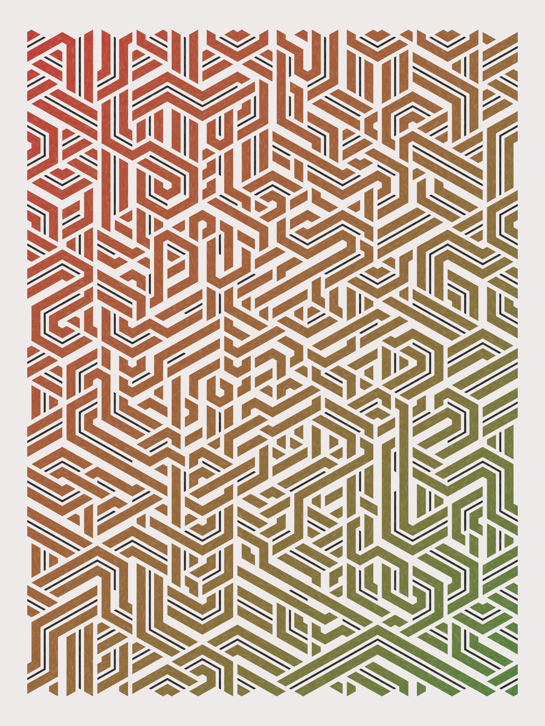 Lines are bent and shaded. There are no wrong turns. [Interaction in live view: press 1-7 or left/right arrow keys to see the stages of sketch construction: 1-grid, 2-divide, 3-tile, 4-bend, 5-shade, 6-color, 7-texture]