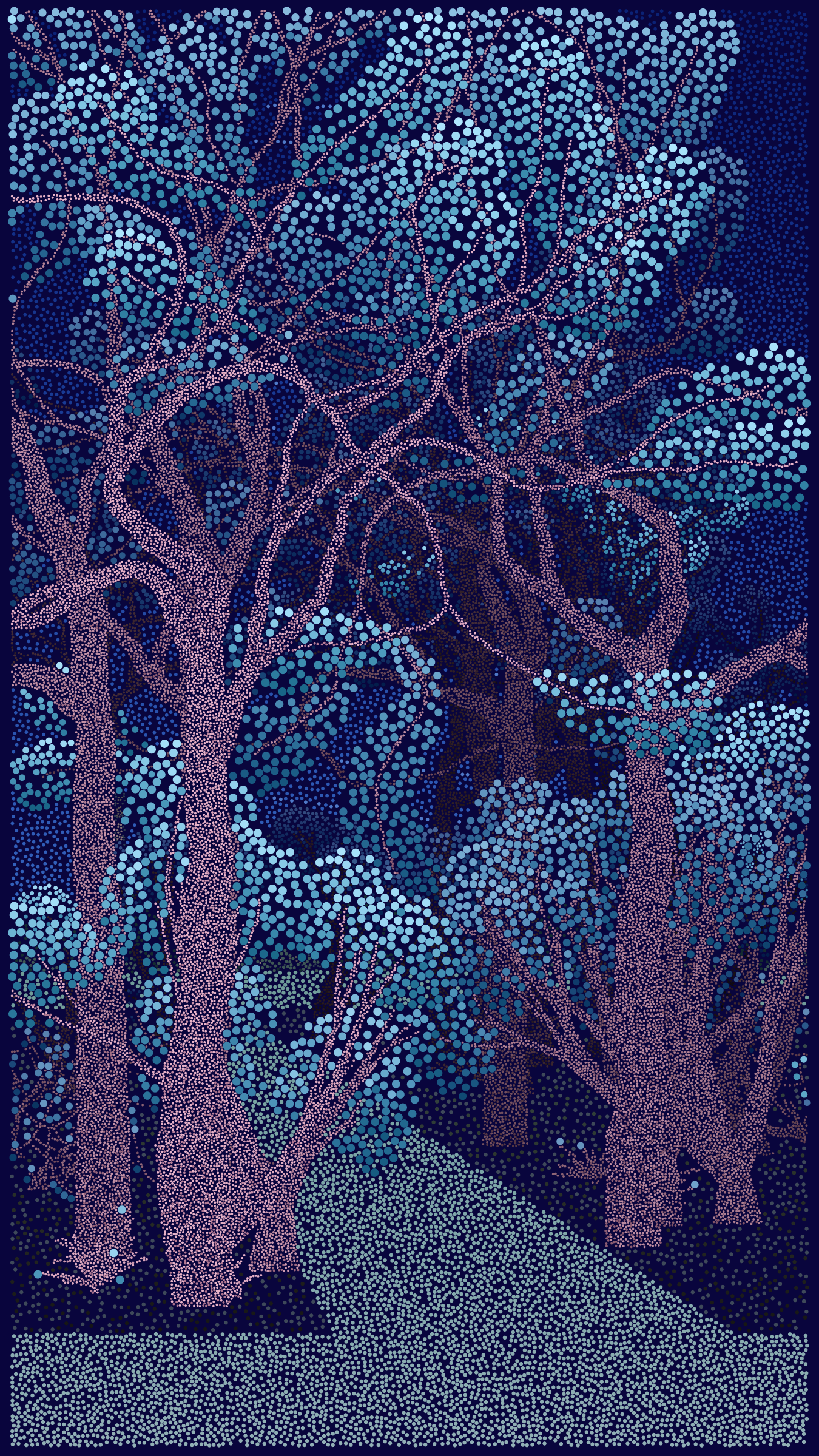 Bosque de Chapultepec is all about how computers can be used as a form of expression. It explores how a generative art algorithm can be used to make something beautiful that is unique to a particular place and time. Bosque de Chapultepec debuted at NFT ART CDMX in 2022, a four day celebration of generative art in Mexico City.