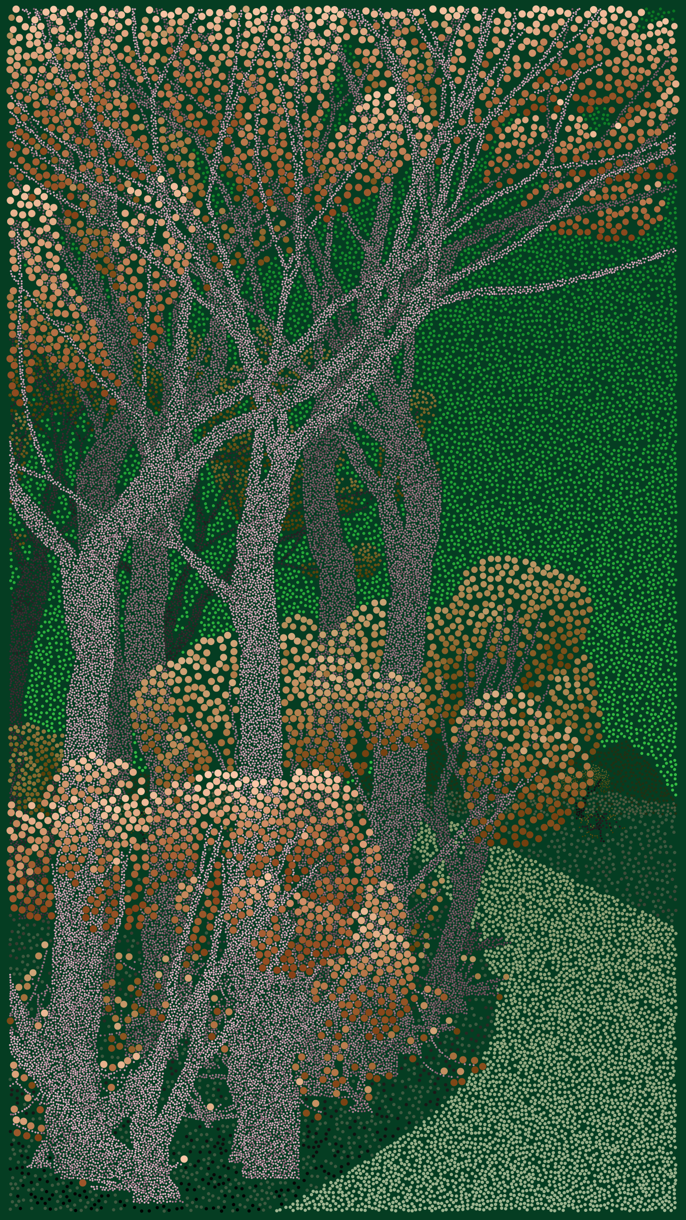 Bosque de Chapultepec is all about how computers can be used as a form of expression. It explores how a generative art algorithm can be used to make something beautiful that is unique to a particular place and time. Bosque de Chapultepec debuted at NFT ART CDMX in 2022, a four day celebration of generative art in Mexico City.