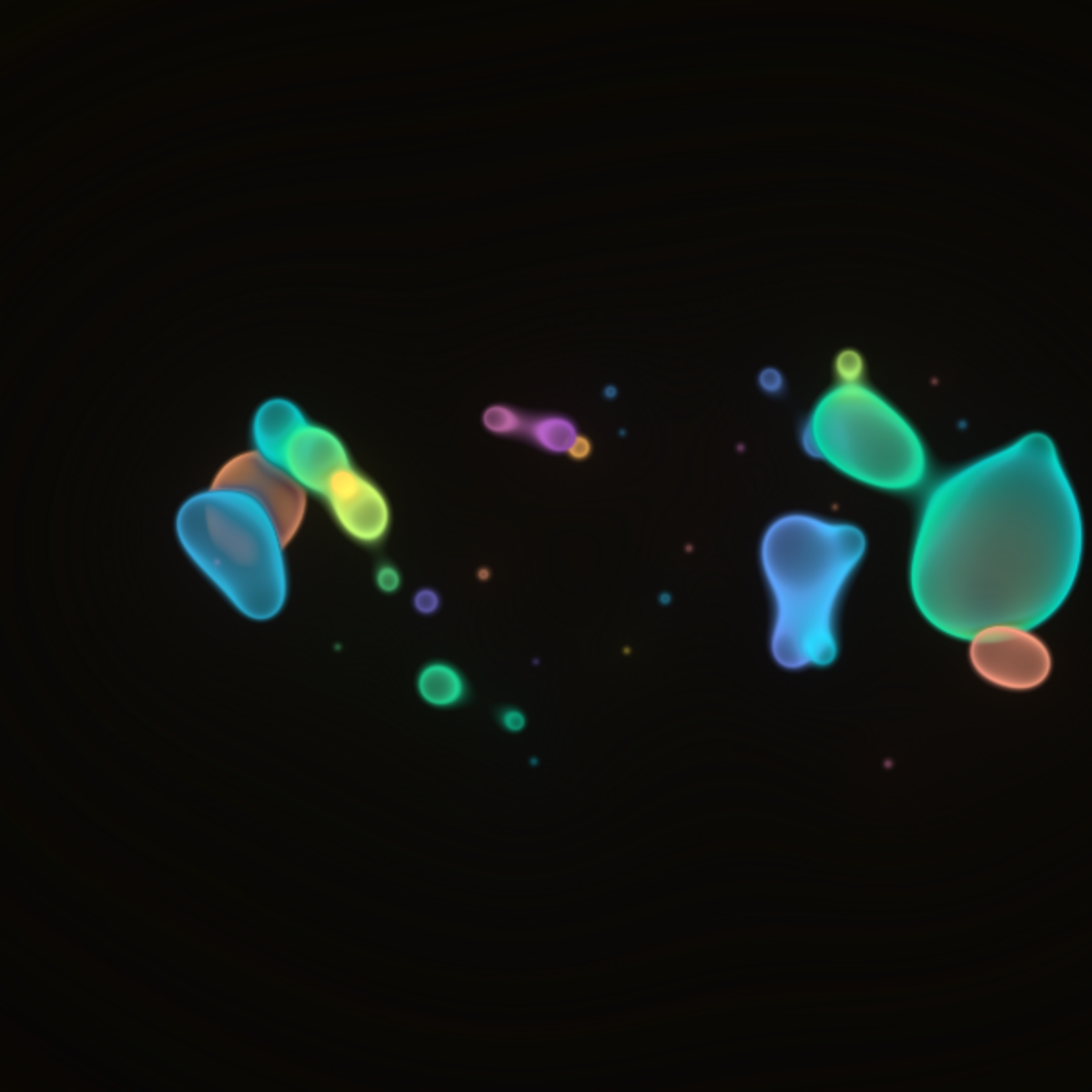 Translucent color bubbles playfully mix and morph to create organic and ephemeral blobby forms. [Shortcuts] spacebar: pause/resume, s: save screenshot, 1→5: high→low resolution. If needed, please adjust resolution or window size for optimal performance.