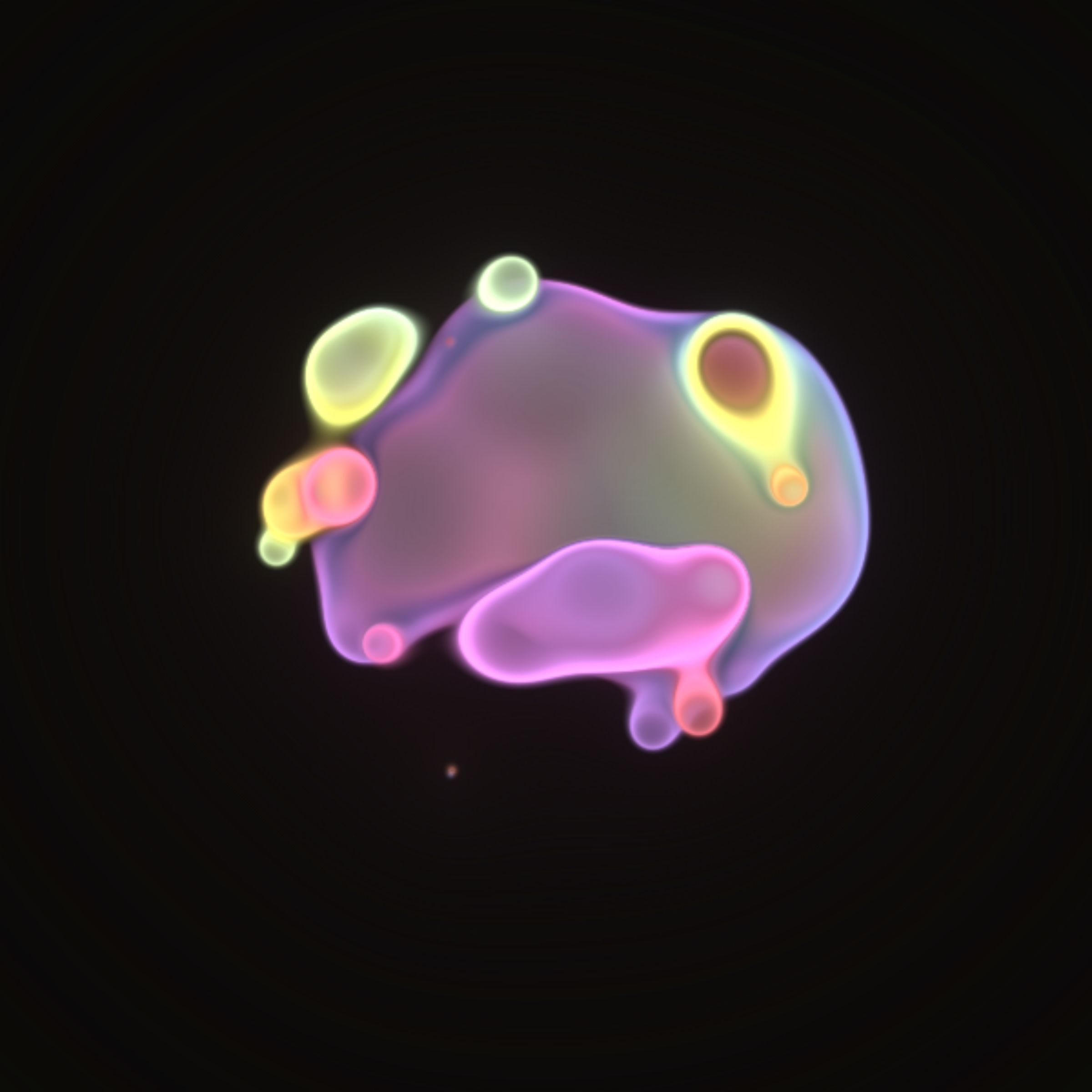 Translucent color bubbles playfully mix and morph to create organic and ephemeral blobby forms. [Shortcuts] spacebar: pause/resume, s: save screenshot, 1→5: high→low resolution. If needed, please adjust resolution or window size for optimal performance.
