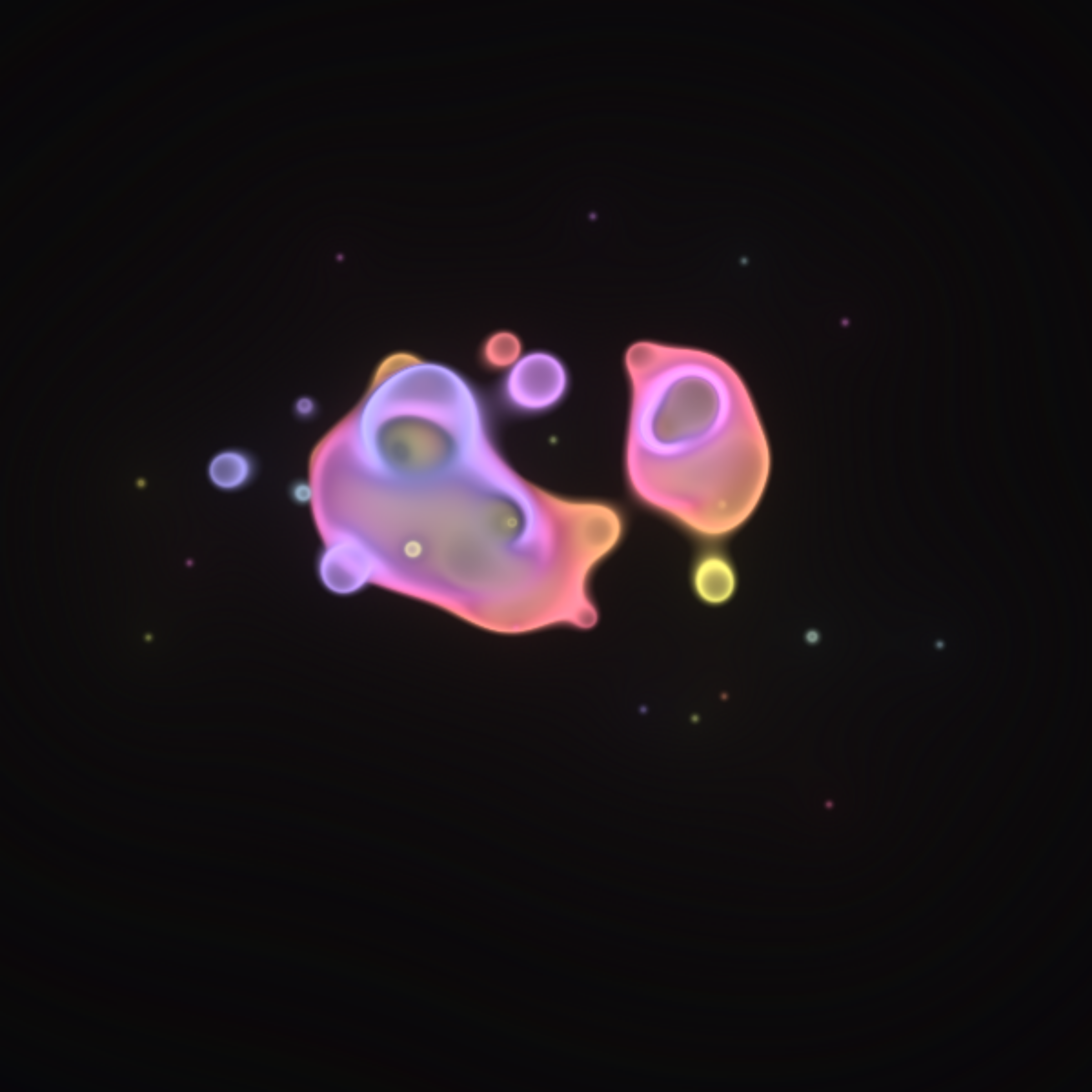 Translucent color bubbles playfully mix and morph to create organic and ephemeral blobby forms. [Shortcuts] spacebar: pause/resume, s: save screenshot, 1→5: high→low resolution. If needed, please adjust resolution or window size for optimal performance.