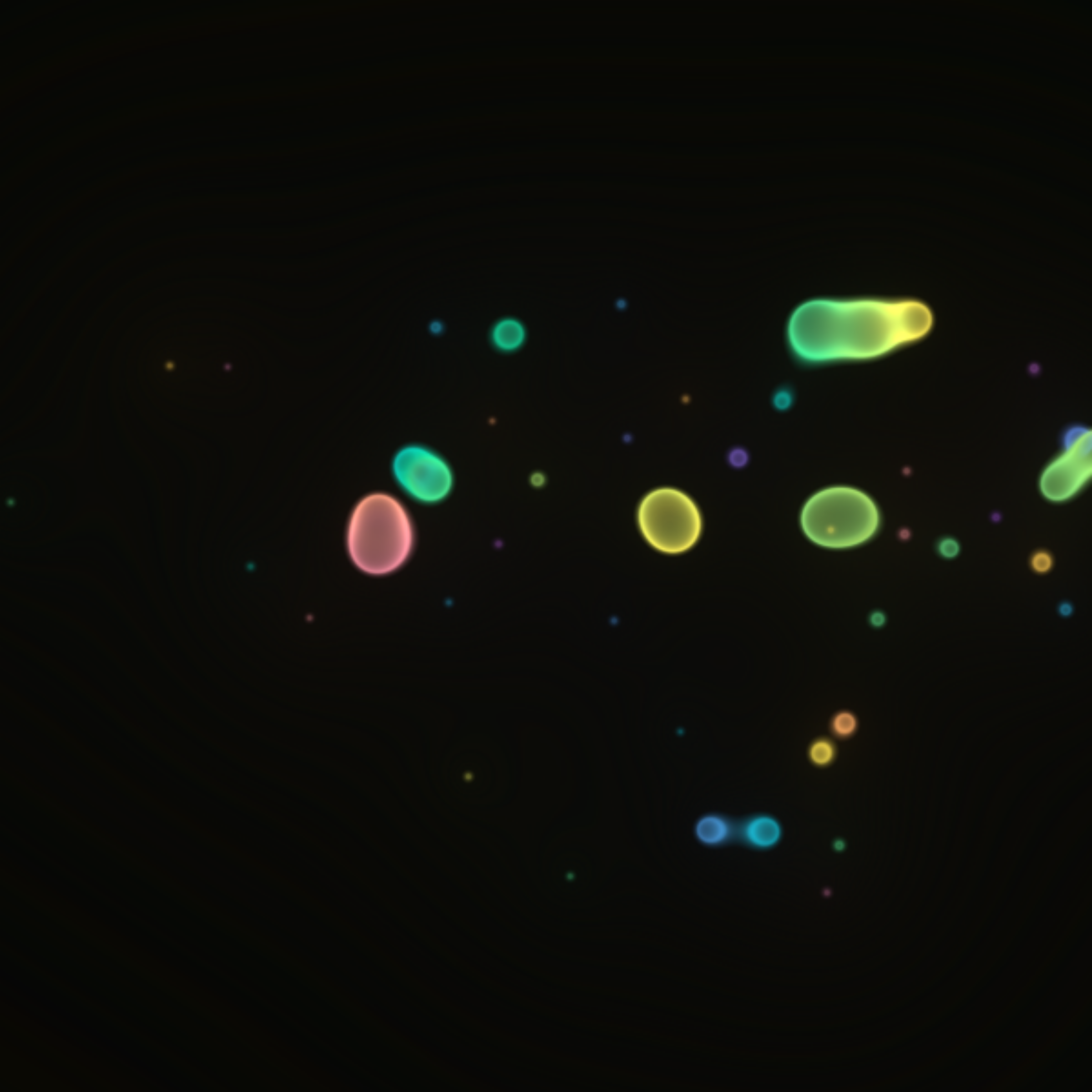 Translucent color bubbles playfully mix and morph to create organic and ephemeral blobby forms. [Shortcuts] spacebar: pause/resume, s: save screenshot, 1→5: high→low resolution. If needed, please adjust resolution or window size for optimal performance.