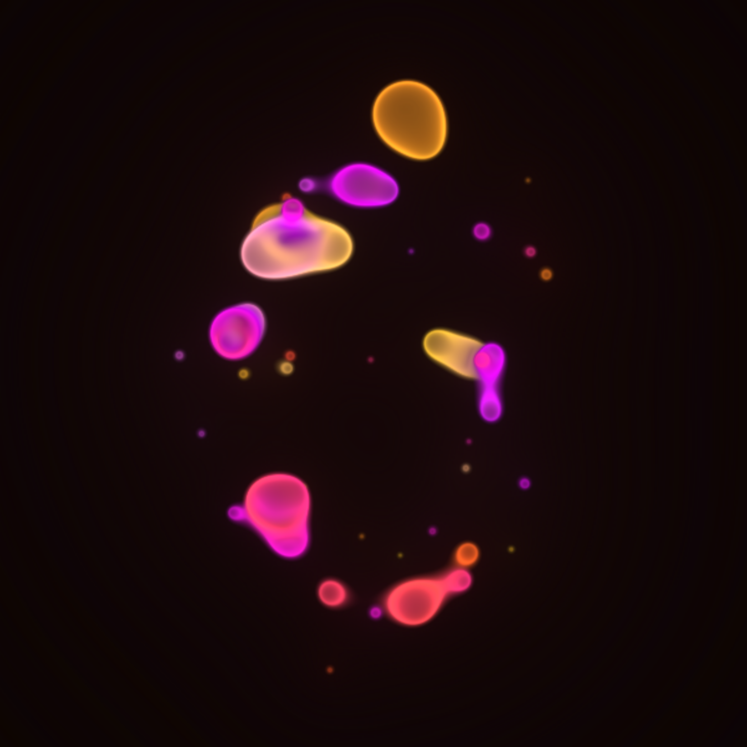 Translucent color bubbles playfully mix and morph to create organic and ephemeral blobby forms. [Shortcuts] spacebar: pause/resume, s: save screenshot, 1→5: high→low resolution. If needed, please adjust resolution or window size for optimal performance.