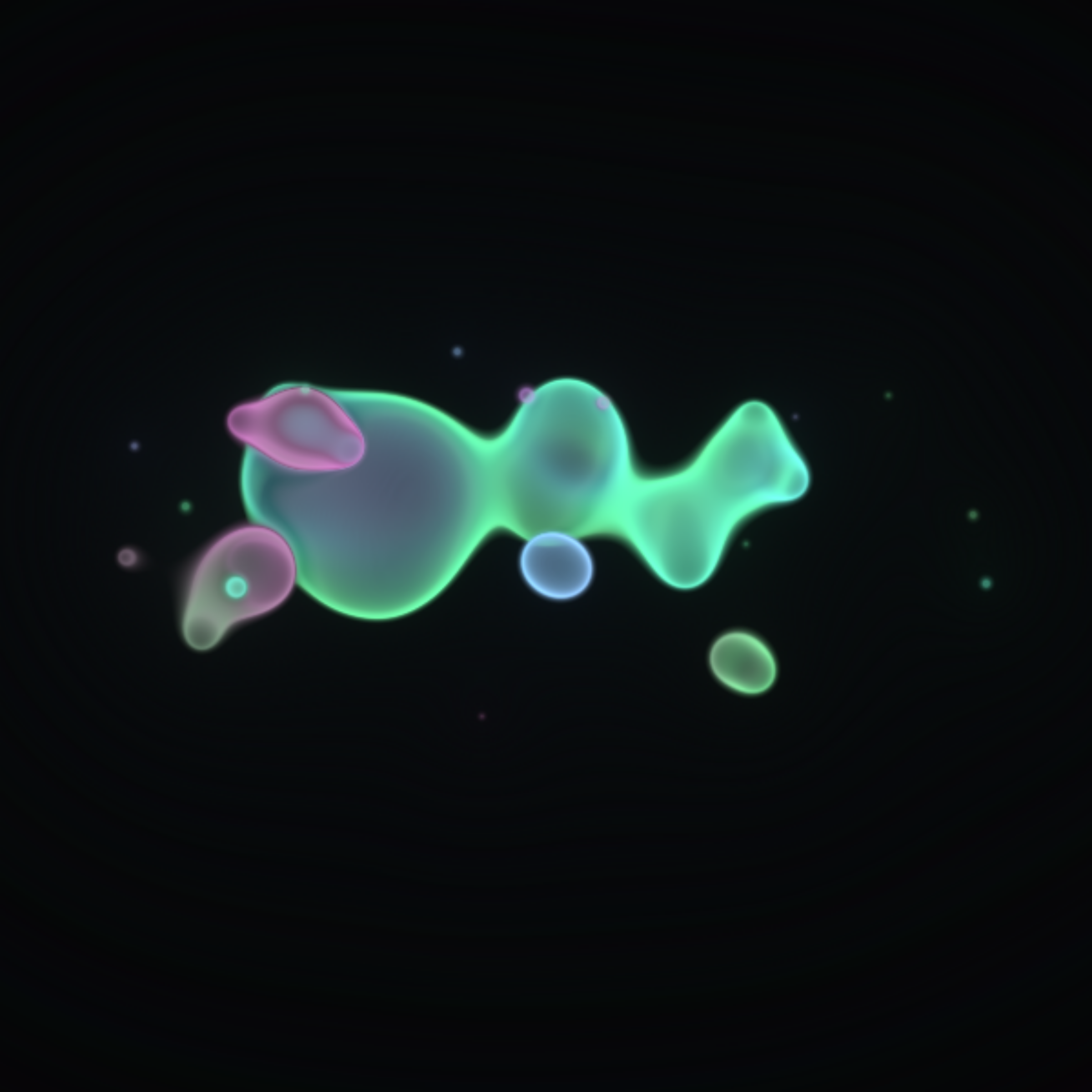 Translucent color bubbles playfully mix and morph to create organic and ephemeral blobby forms. [Shortcuts] spacebar: pause/resume, s: save screenshot, 1→5: high→low resolution. If needed, please adjust resolution or window size for optimal performance.