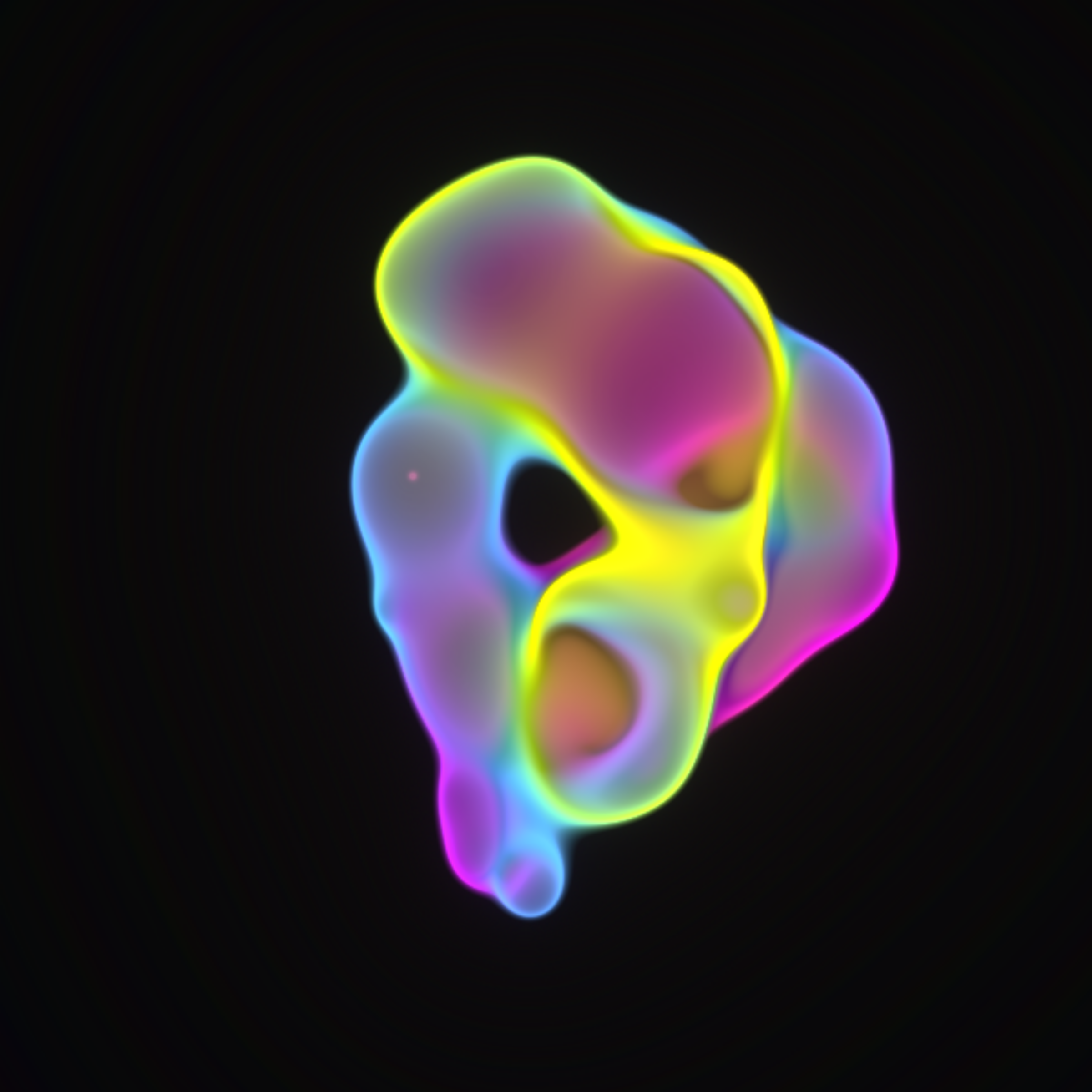 Translucent color bubbles playfully mix and morph to create organic and ephemeral blobby forms. [Shortcuts] spacebar: pause/resume, s: save screenshot, 1→5: high→low resolution. If needed, please adjust resolution or window size for optimal performance.
