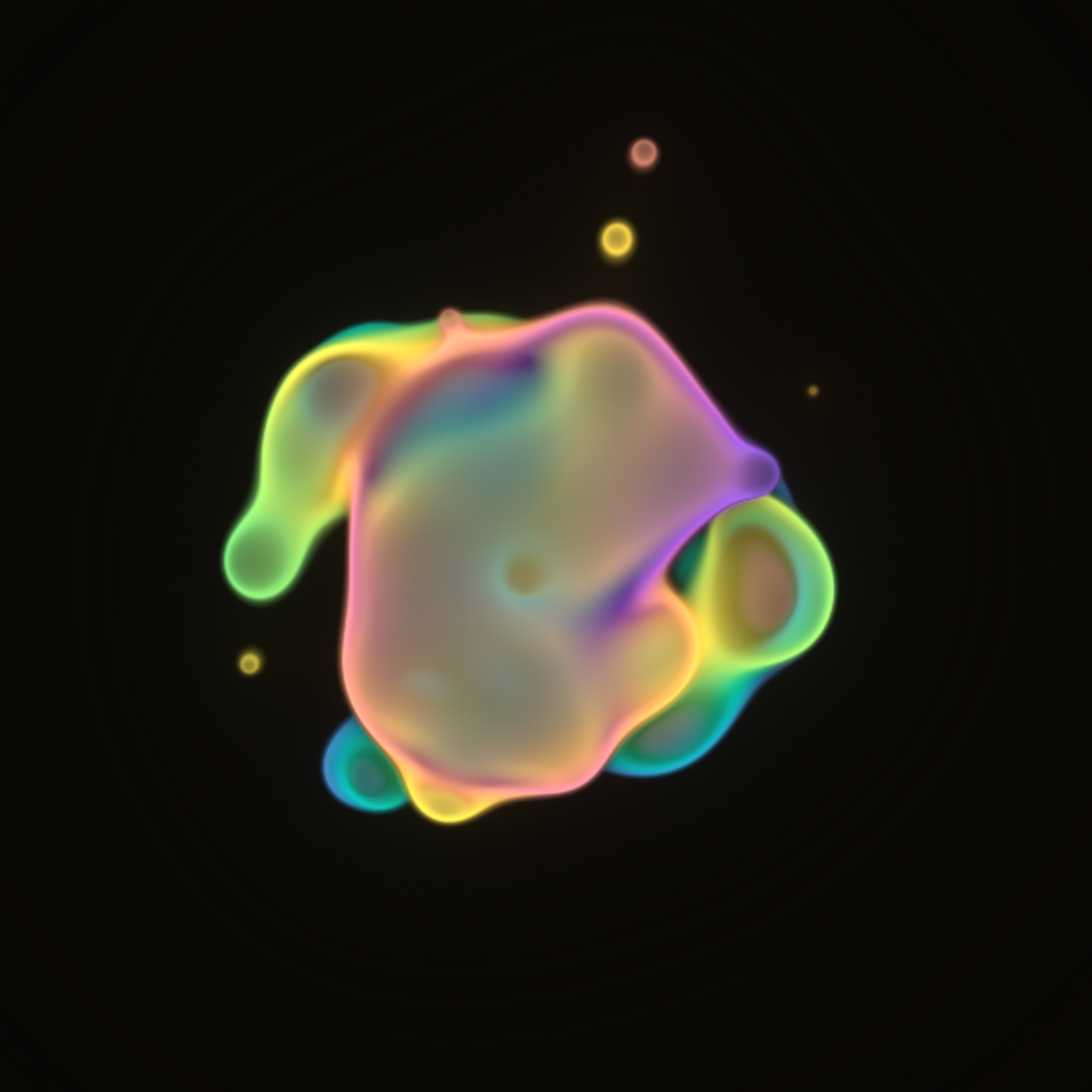 Translucent color bubbles playfully mix and morph to create organic and ephemeral blobby forms. [Shortcuts] spacebar: pause/resume, s: save screenshot, 1→5: high→low resolution. If needed, please adjust resolution or window size for optimal performance.