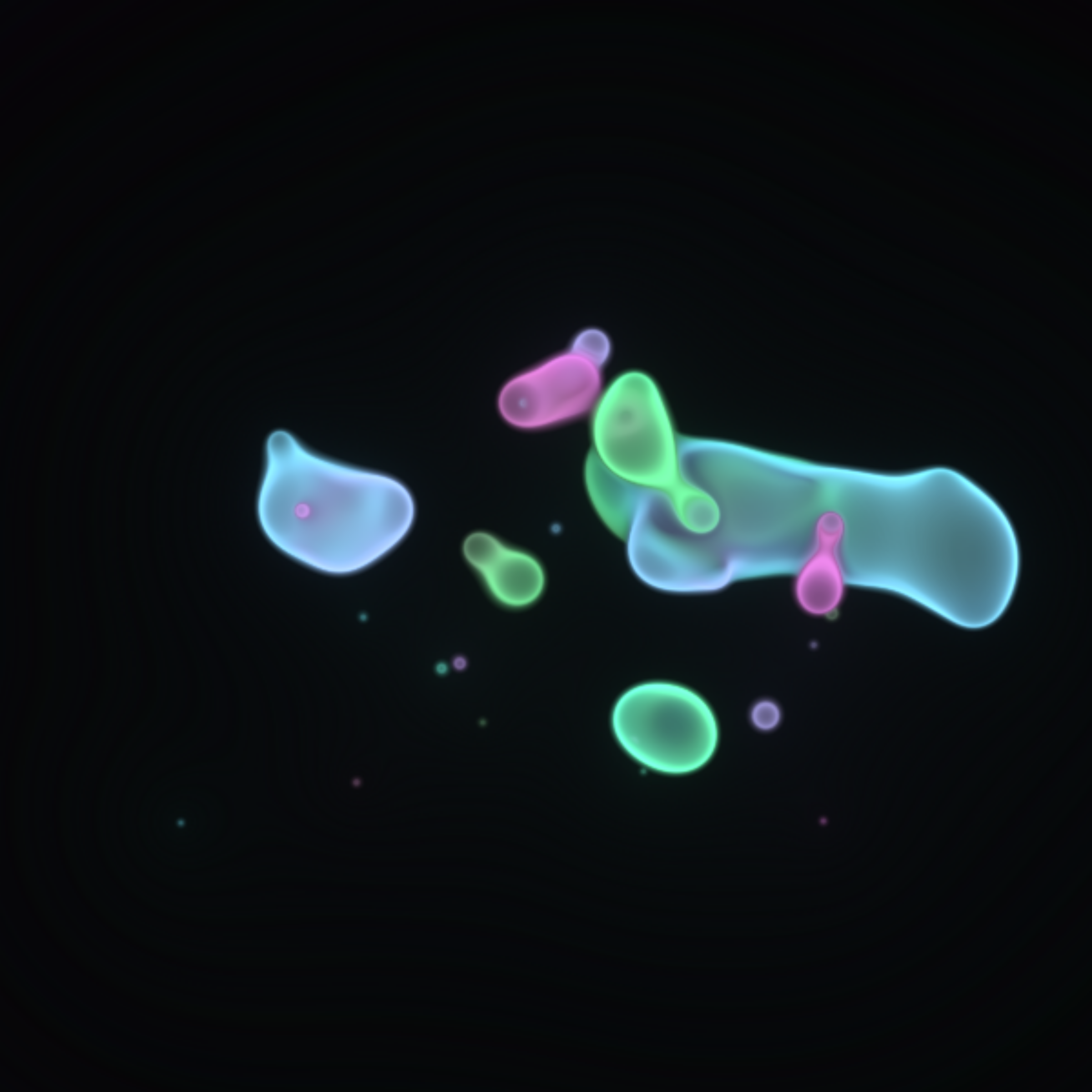 Translucent color bubbles playfully mix and morph to create organic and ephemeral blobby forms. [Shortcuts] spacebar: pause/resume, s: save screenshot, 1→5: high→low resolution. If needed, please adjust resolution or window size for optimal performance.