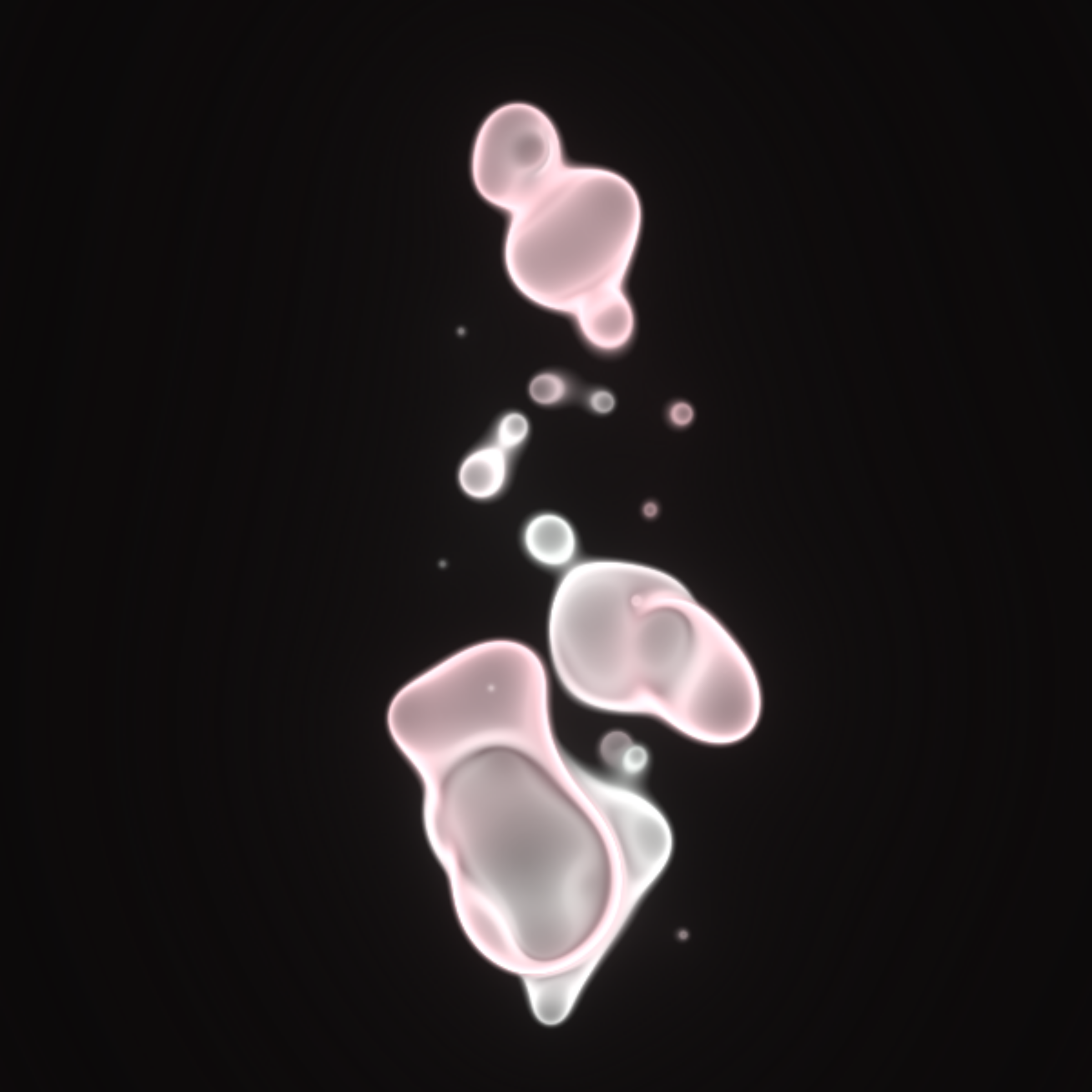Translucent color bubbles playfully mix and morph to create organic and ephemeral blobby forms. [Shortcuts] spacebar: pause/resume, s: save screenshot, 1→5: high→low resolution. If needed, please adjust resolution or window size for optimal performance.