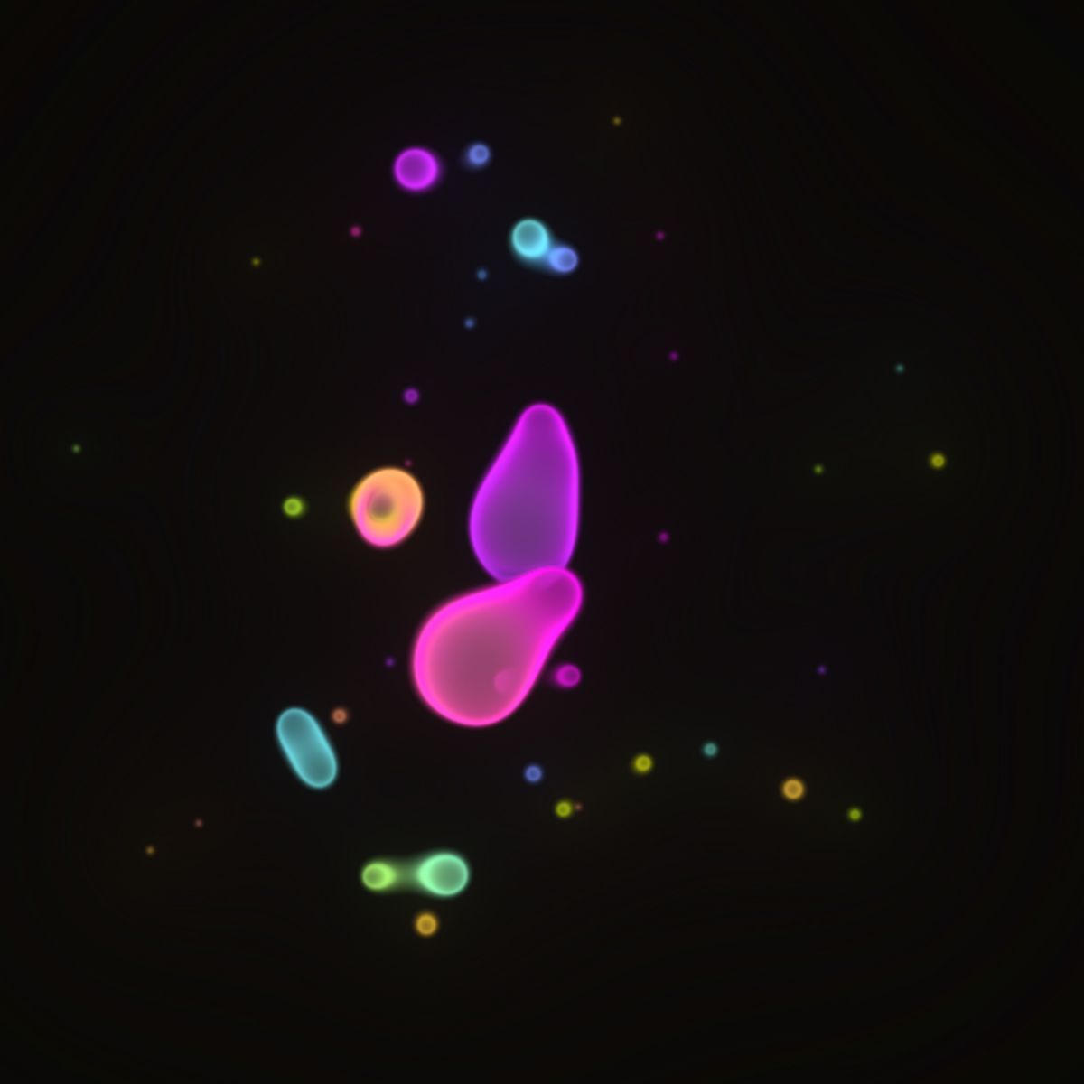 Translucent color bubbles playfully mix and morph to create organic and ephemeral blobby forms. [Shortcuts] spacebar: pause/resume, s: save screenshot, 1→5: high→low resolution. If needed, please adjust resolution or window size for optimal performance.