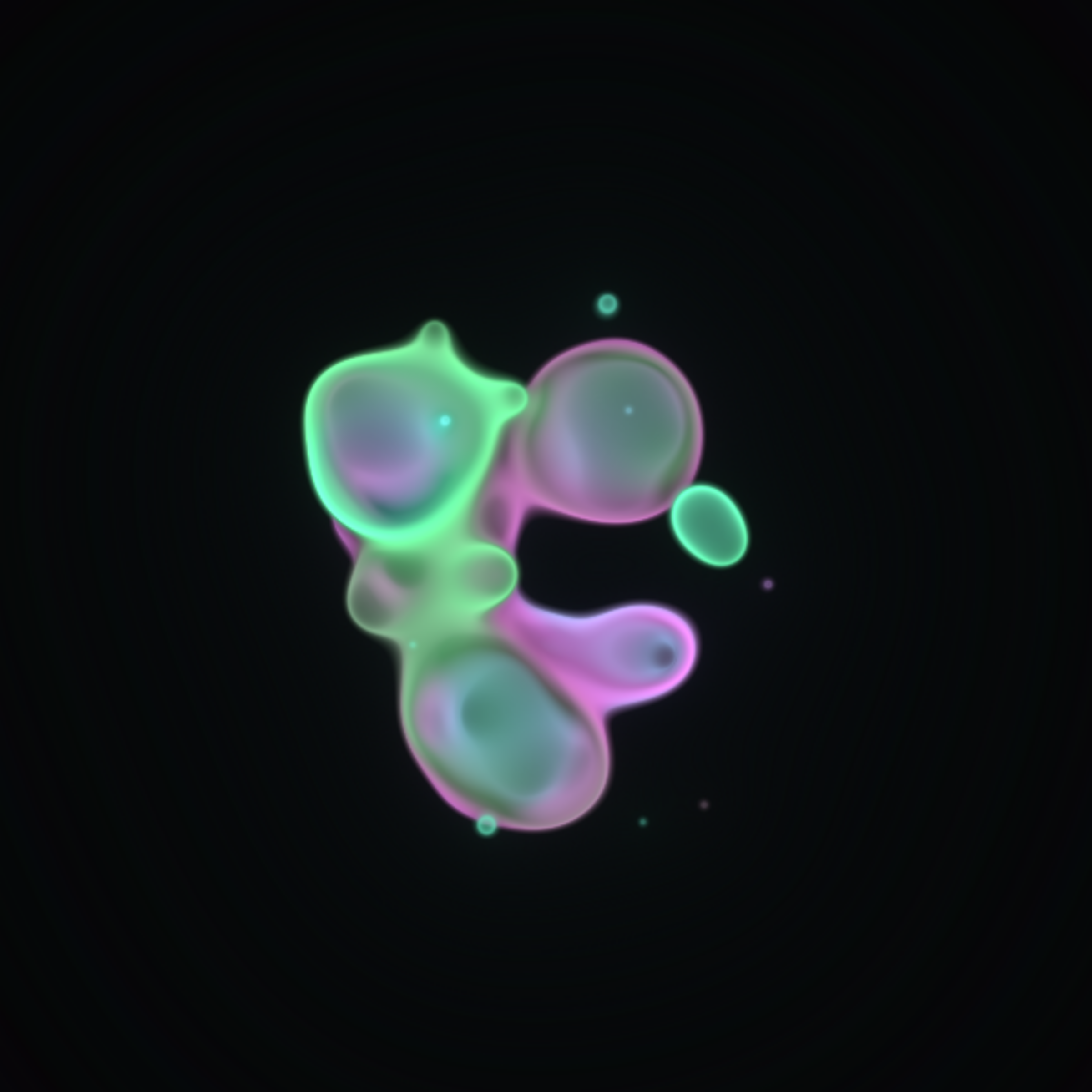 Translucent color bubbles playfully mix and morph to create organic and ephemeral blobby forms. [Shortcuts] spacebar: pause/resume, s: save screenshot, 1→5: high→low resolution. If needed, please adjust resolution or window size for optimal performance.